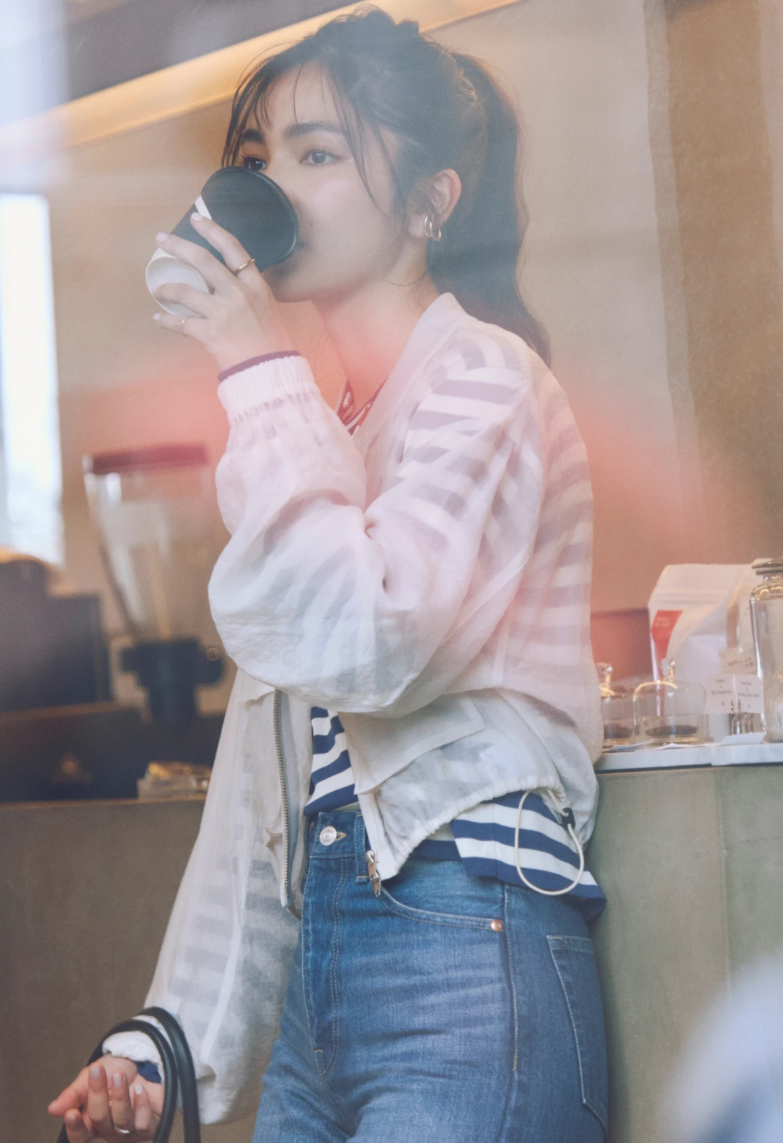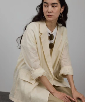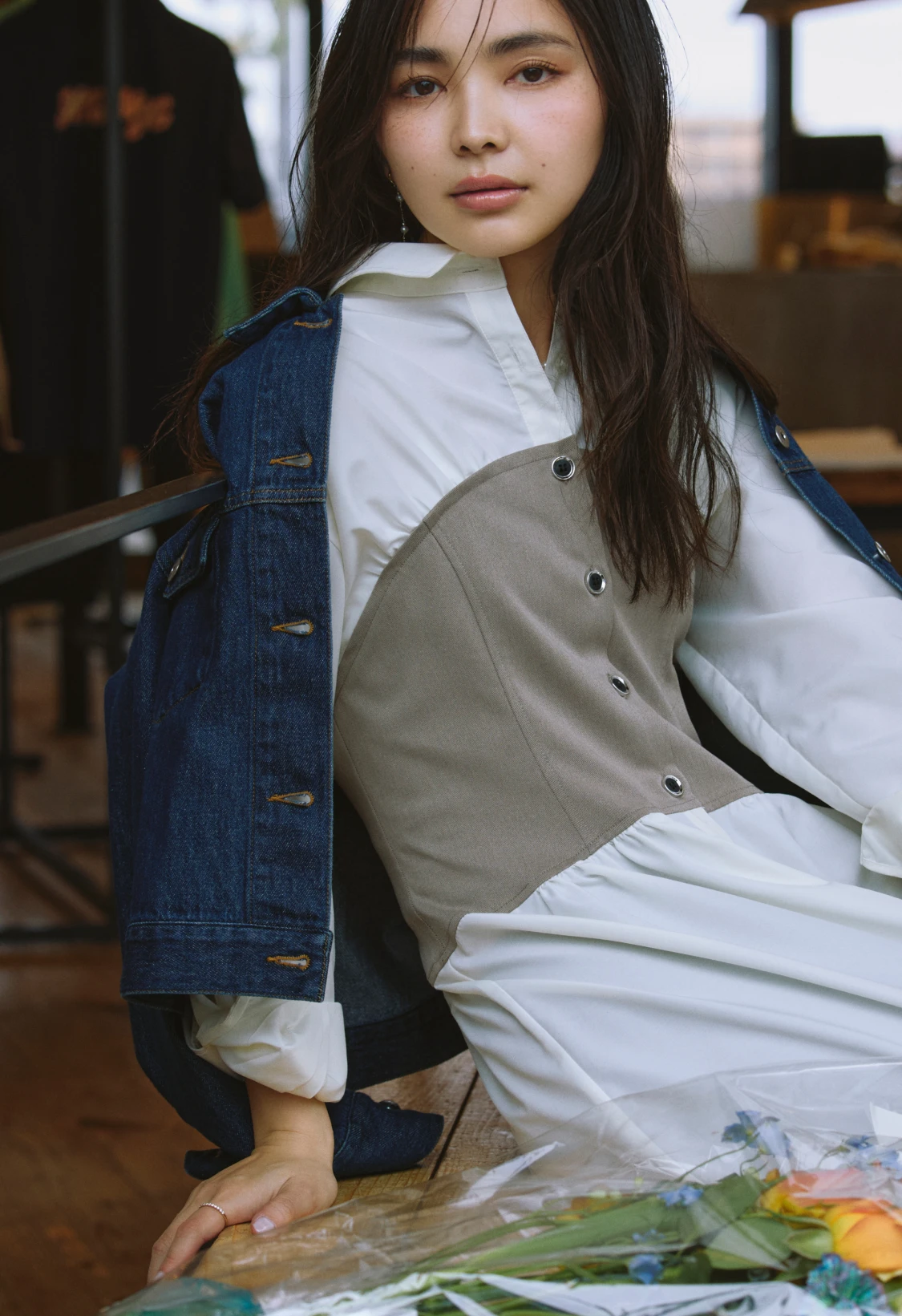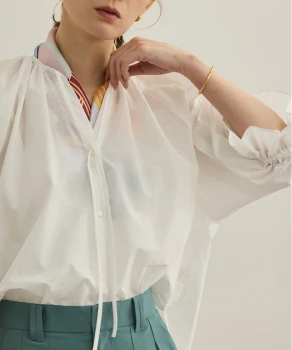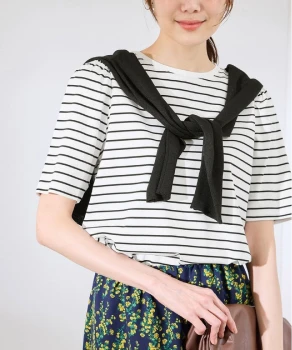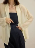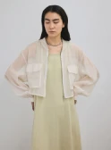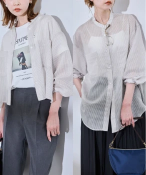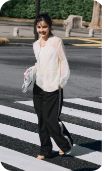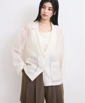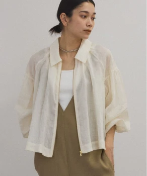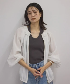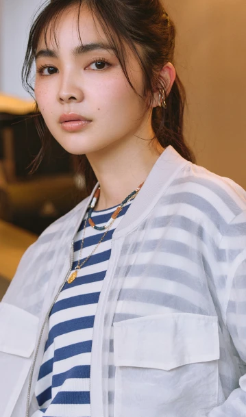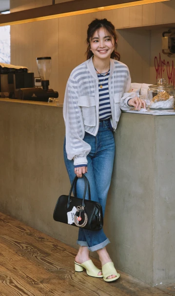 ロンTとデニムのシンプルな組み合わせには、軽やかなシアーブルゾンとライムグリーンのミュールサンダルをプラス。ベーシックにまとまりすぎず、リラックスムード漂うこなれたスタイルへブラッシュアップ。