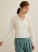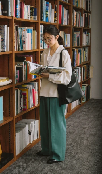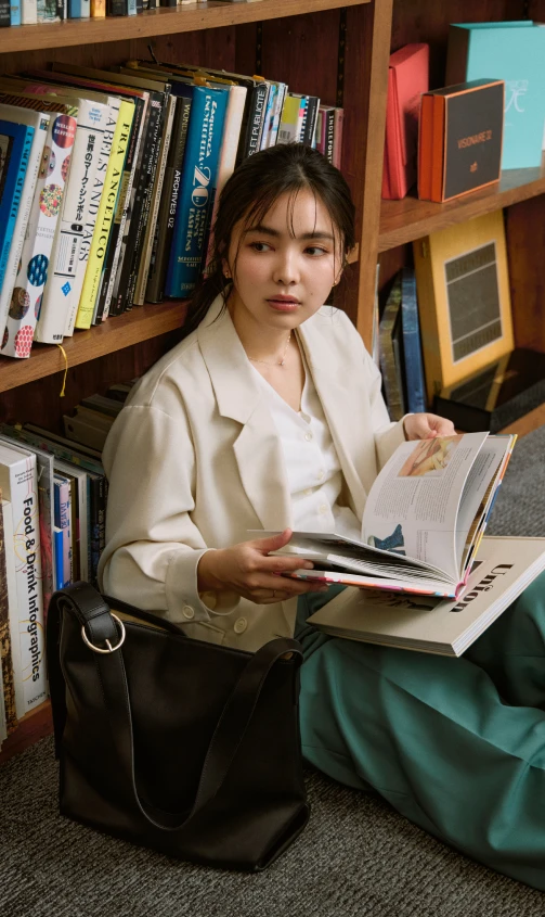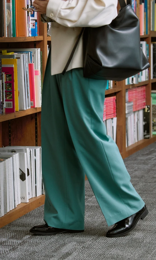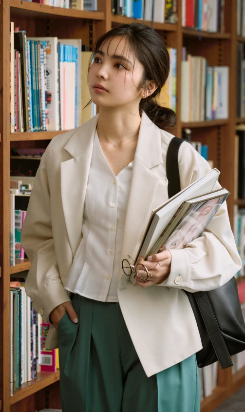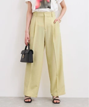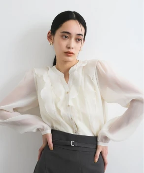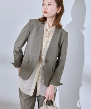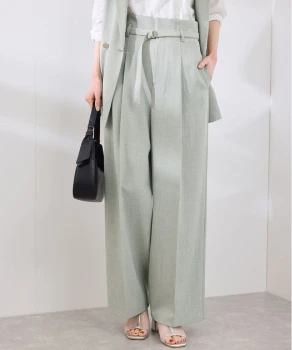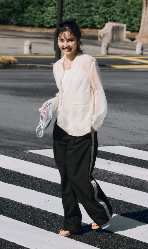 トラッドな印象を与えるジャケットとパンツには、フリルのブラウスを合わせれば華やかさが引き立ちグッドバランス。パンツはきれい色をチョイスして春らしさを。小物はブラックで統一して全体を引き締めて。