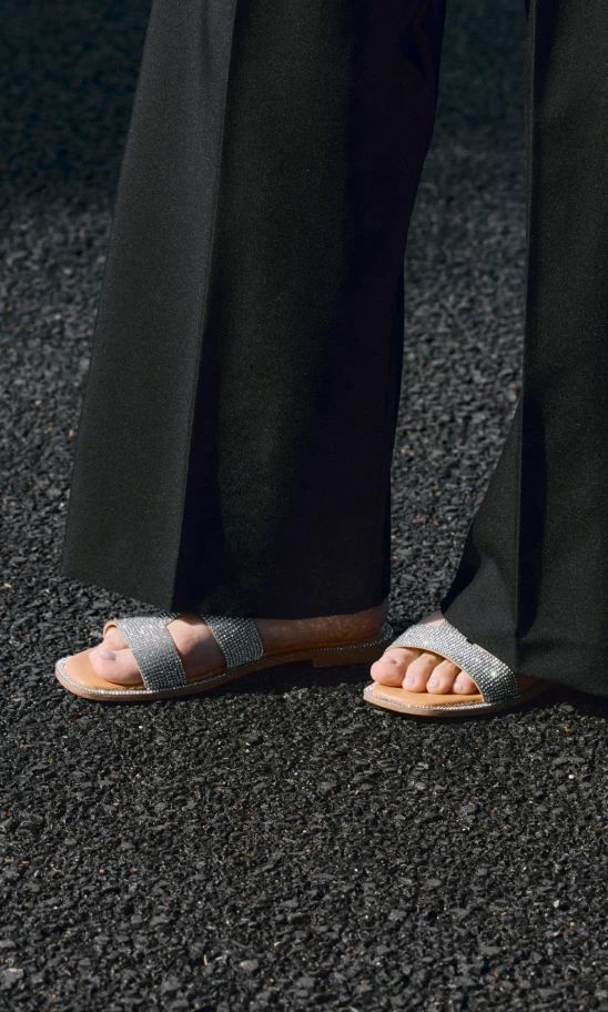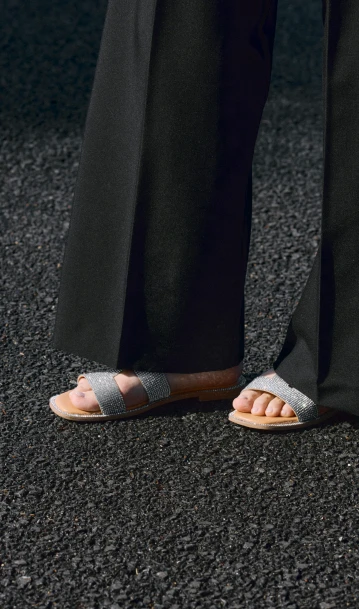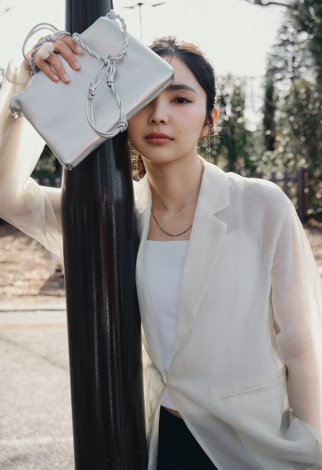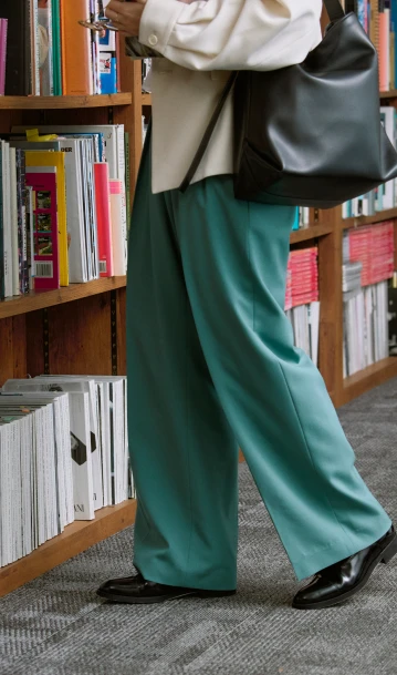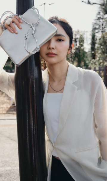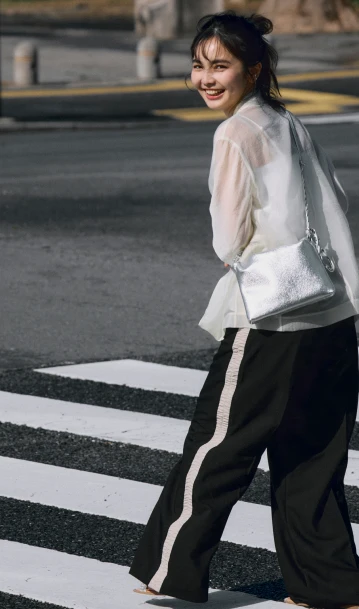 おしゃれモチベがいつも以上に上がる女子会。サイドラインがポイントのワイドパンツをメインにモノトーンでまとめたら、小物はシャイニーなシルバーをセレクト。特別感を引き出し、都会的なムードを演出してくれる。