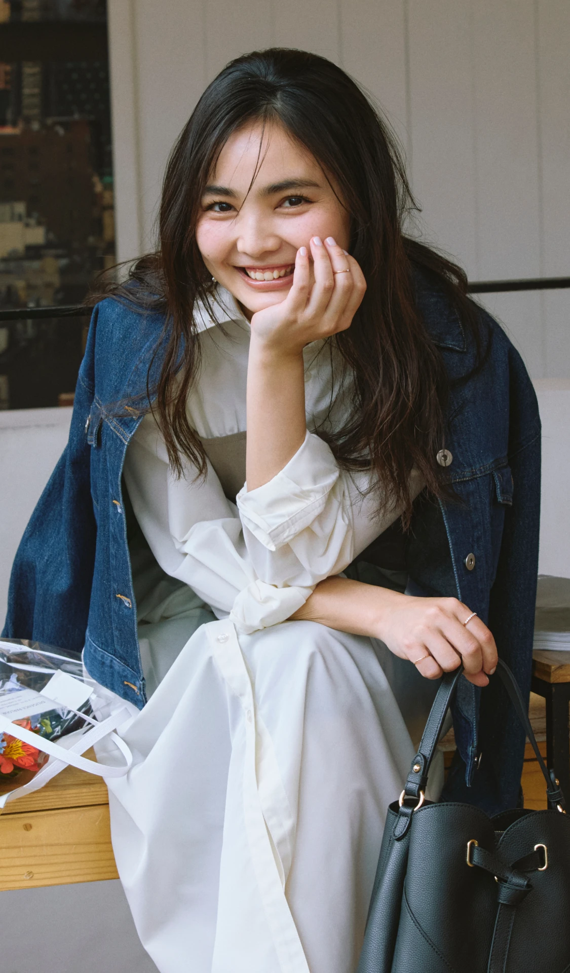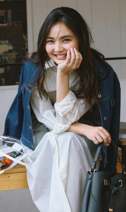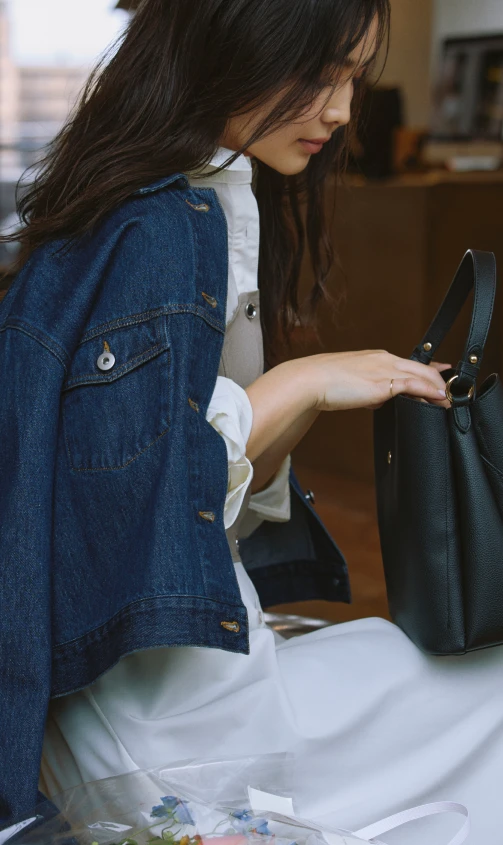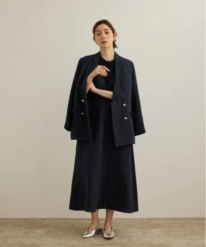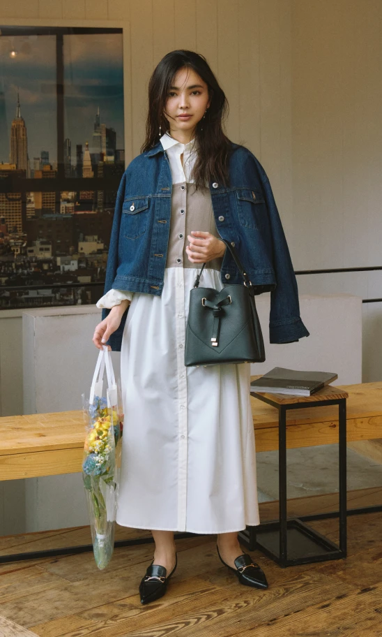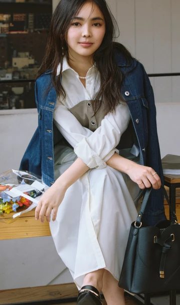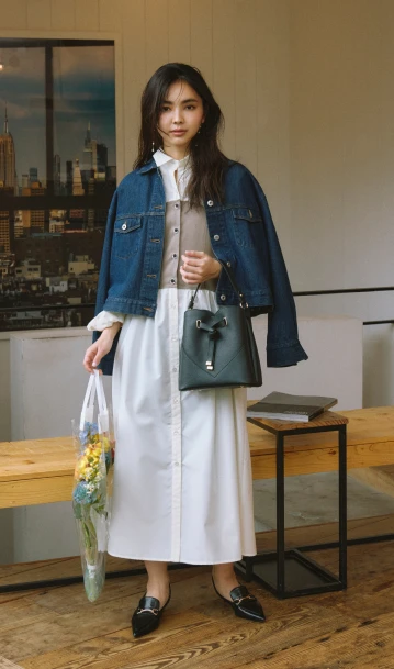 1枚でサマになるドッキングワンピースは、特別感が欲しいデートにぴったり。濃いネイビーのデニムジャケットを合わせれば、レディライクに決まりすぎずほどよくカジュアルダウン。肩掛けにしたり、羽織る際は袖をロールアップしたり、ポイントは抜け感を出すこと。