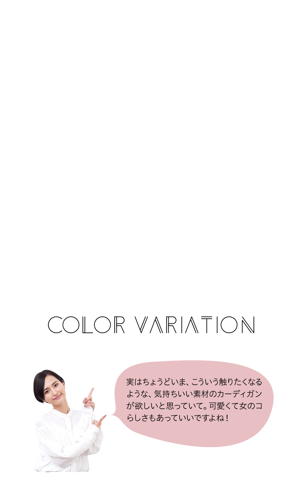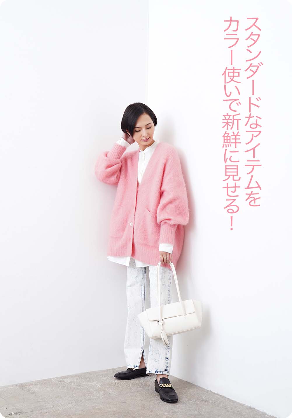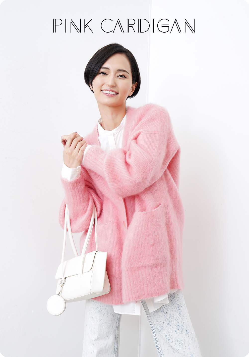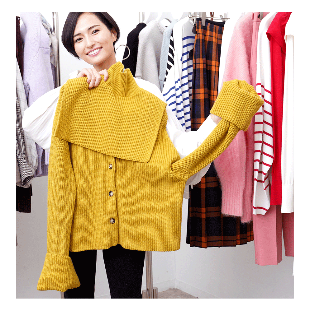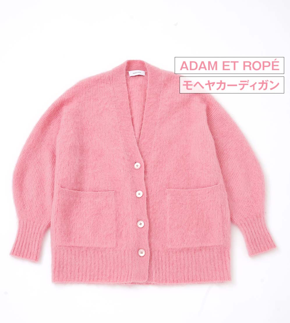 今シーズンの『ADAM ET ROPÉ』は、定番のデザインを新鮮な印象にアップデートするのがテーマ。スタンダードなカーディガンも、ピンクに変えるだけでモードな印象になって新鮮!「ふだんはモノトーンが多いのであまり選ばない色を着てみたくて、これを選びました(山賀さん)」