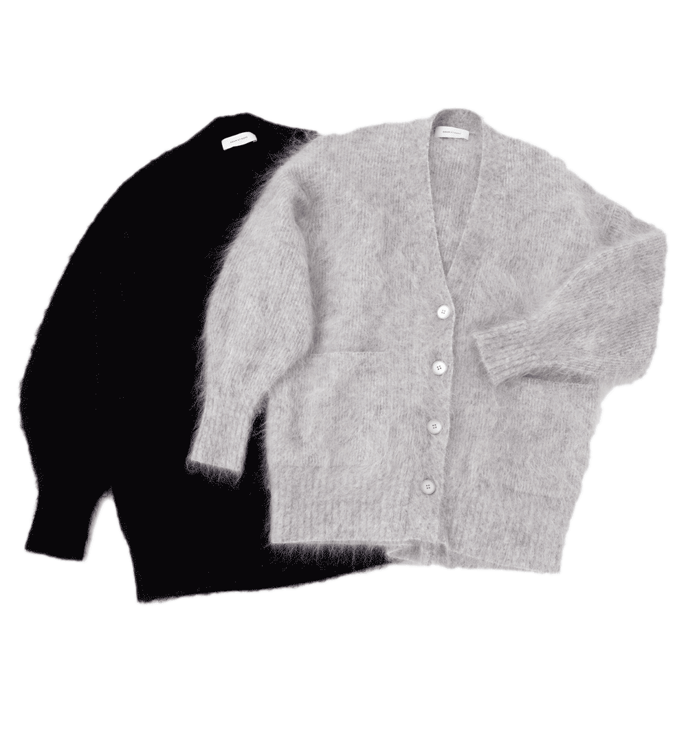 起毛加工を施した、ふさふさとした長い毛足が特徴。両畦編みでふっくらとボリュームがありつつ、驚くほど軽くて着心地がいい一枚です。後ろが少し長くなっているルーズなシルエットで、力の抜けた印象に見えるので格好よく着こなせます。