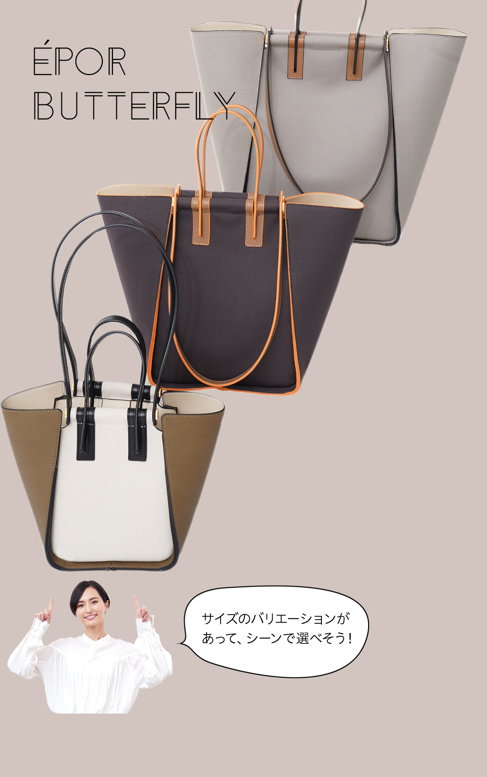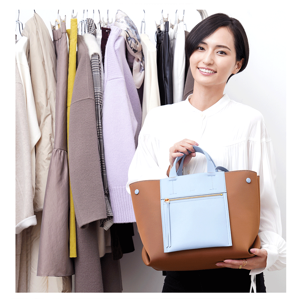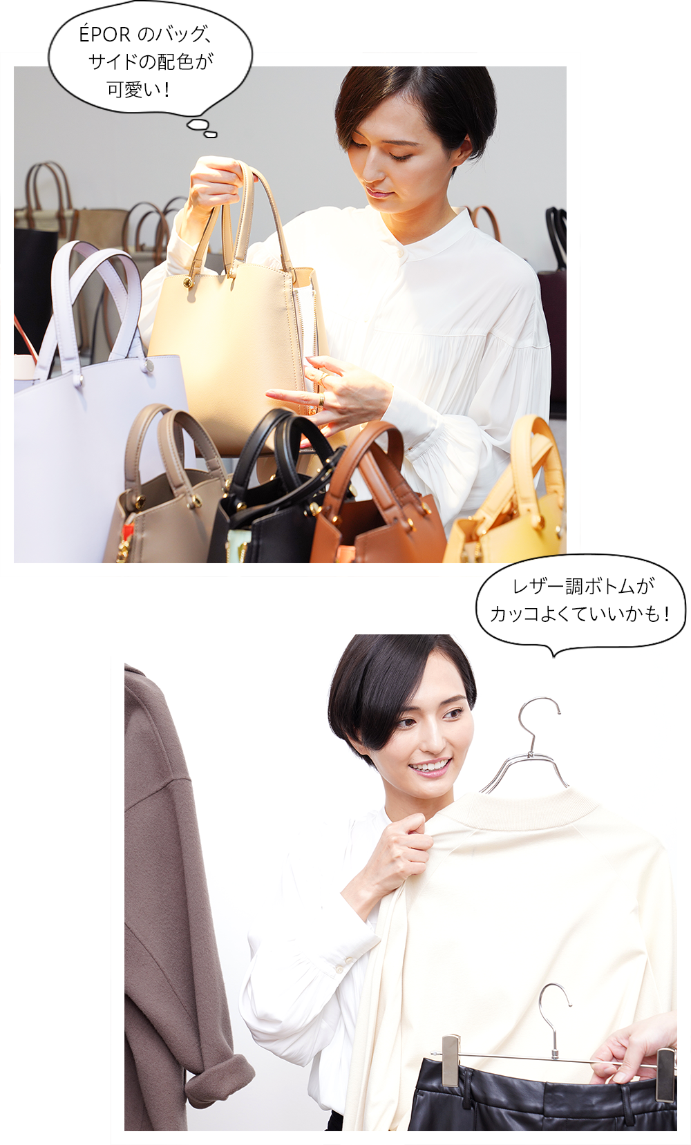 ずらりと並んだ『ÉPOR』プレスルームのバッグ。「バッグはすごく使いやすそうです。ファスナーを開けるとサイドの色が見えて、いいポイントになりますね。サイズが細かく選べるのもいいですね(山賀さん)」。スタイリングもいくつかのボトムを合わせてチェック。「レザー調のパンツで、クールな感じにするのがしっくりきそう。私服のイメージで合わせてみました!」