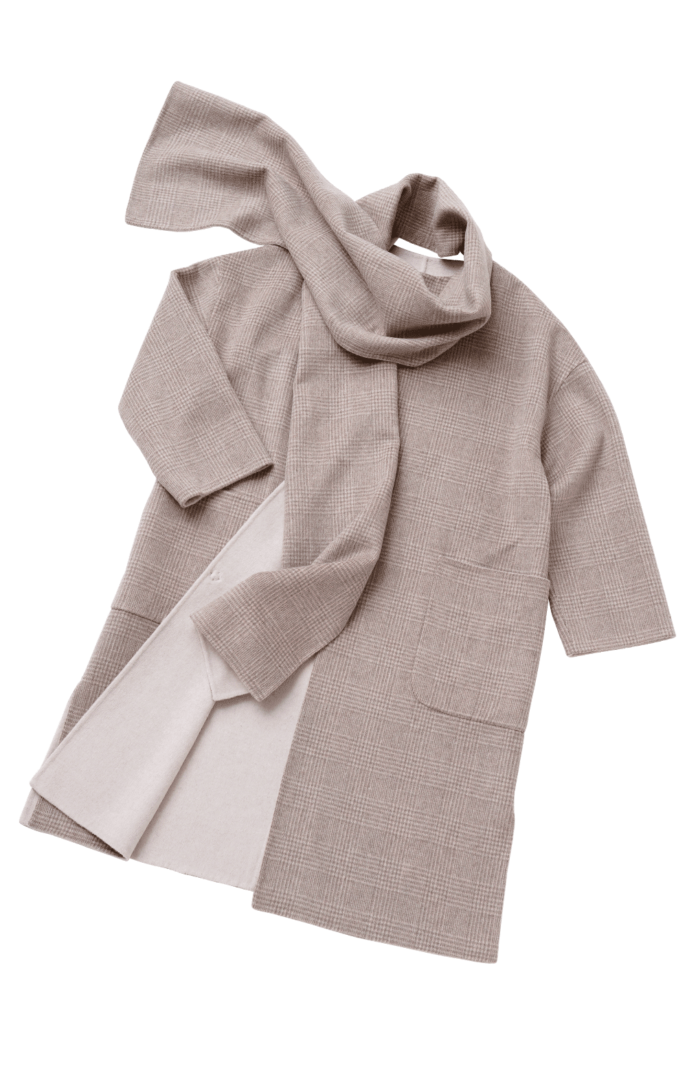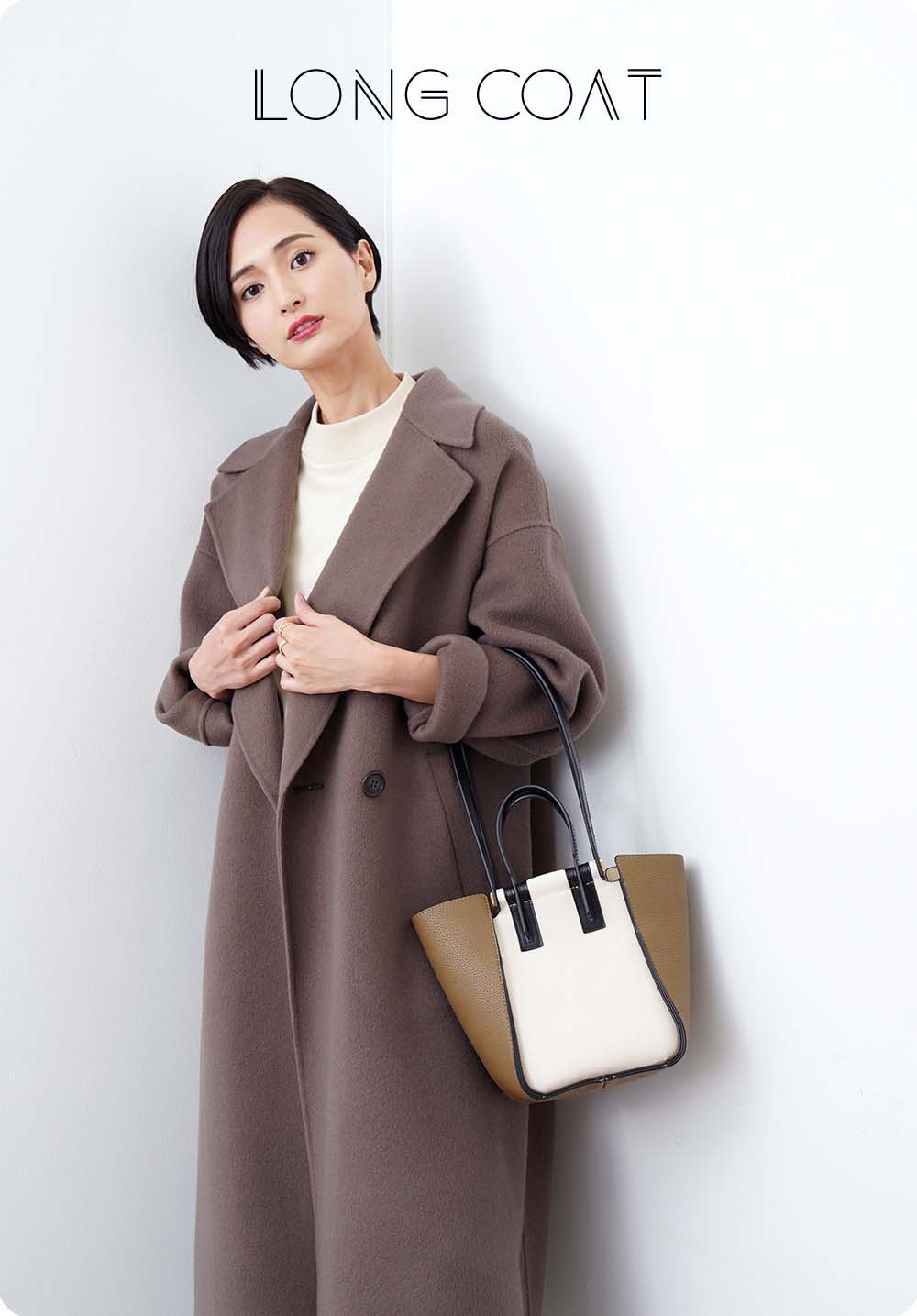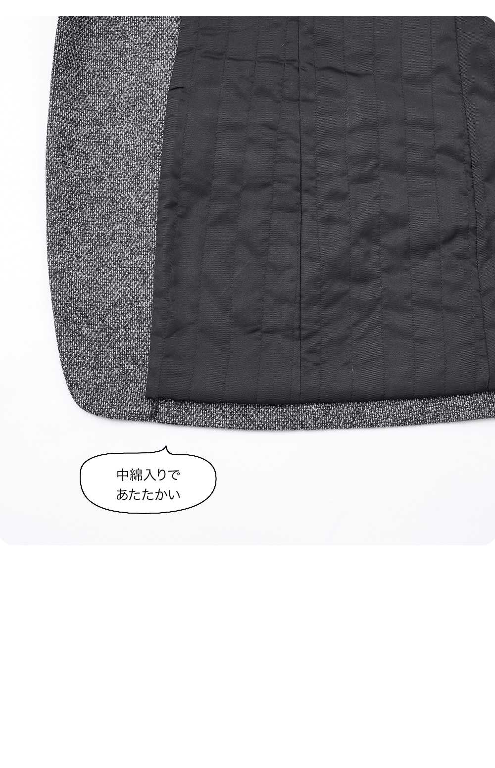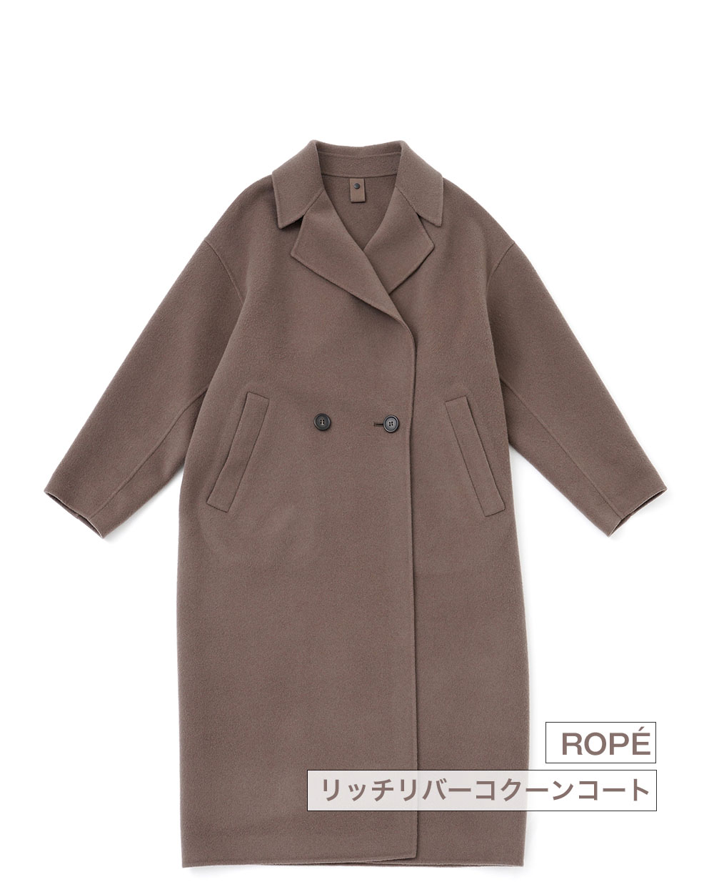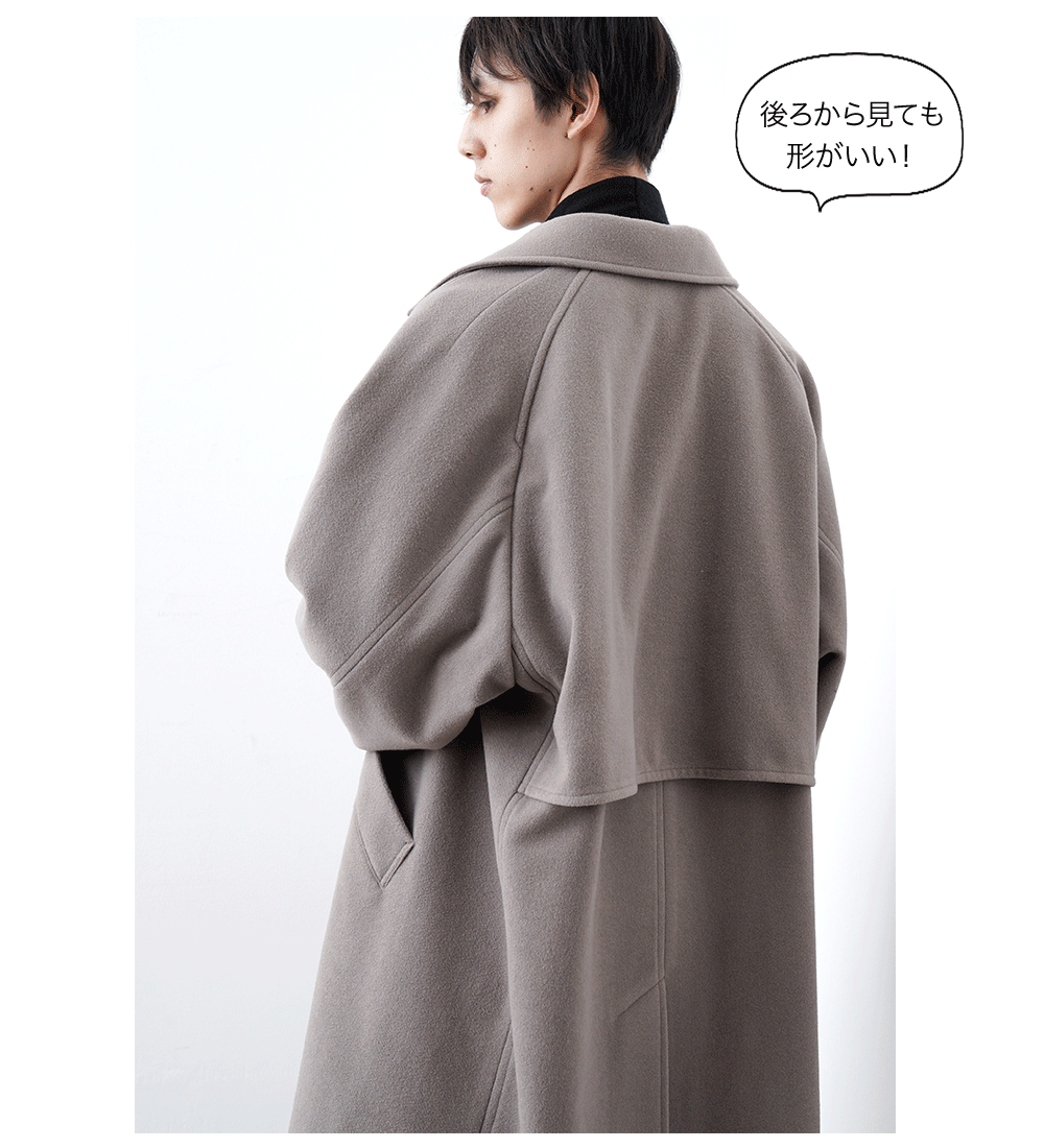 ボリューム感のあるリッチなコート。軽さや保温性、光沢感もポイントです。素材はオーストラリア羊毛の超極細原毛「スーパー140S」に、クイーンズランド州の高品質なラムウールを30%ブレンドした、オリジナル原料を使用。日本の織物の名産地・尾州で織り上げ、手間のかかる方法でダブルフェイスに仕立てました。縫い代がないのですっきりキレイに、軽く仕上がっています。立体的なカッティングで、ボリュームのあるシルエットをスッキリと見せてくれるデザインにしています。