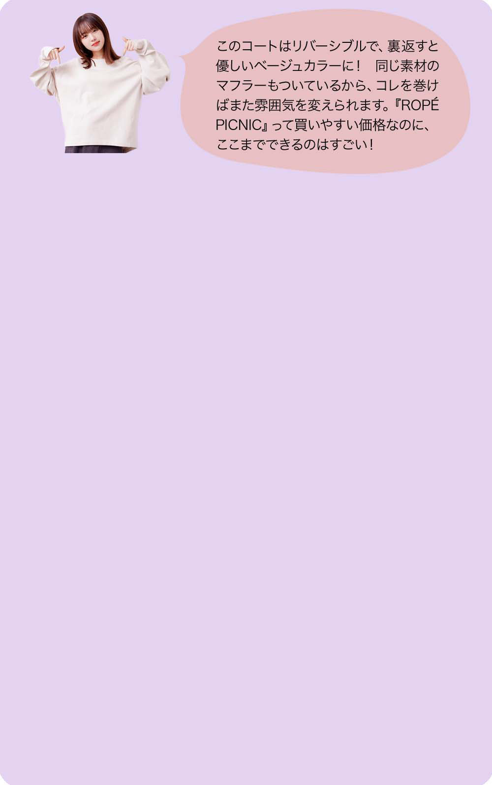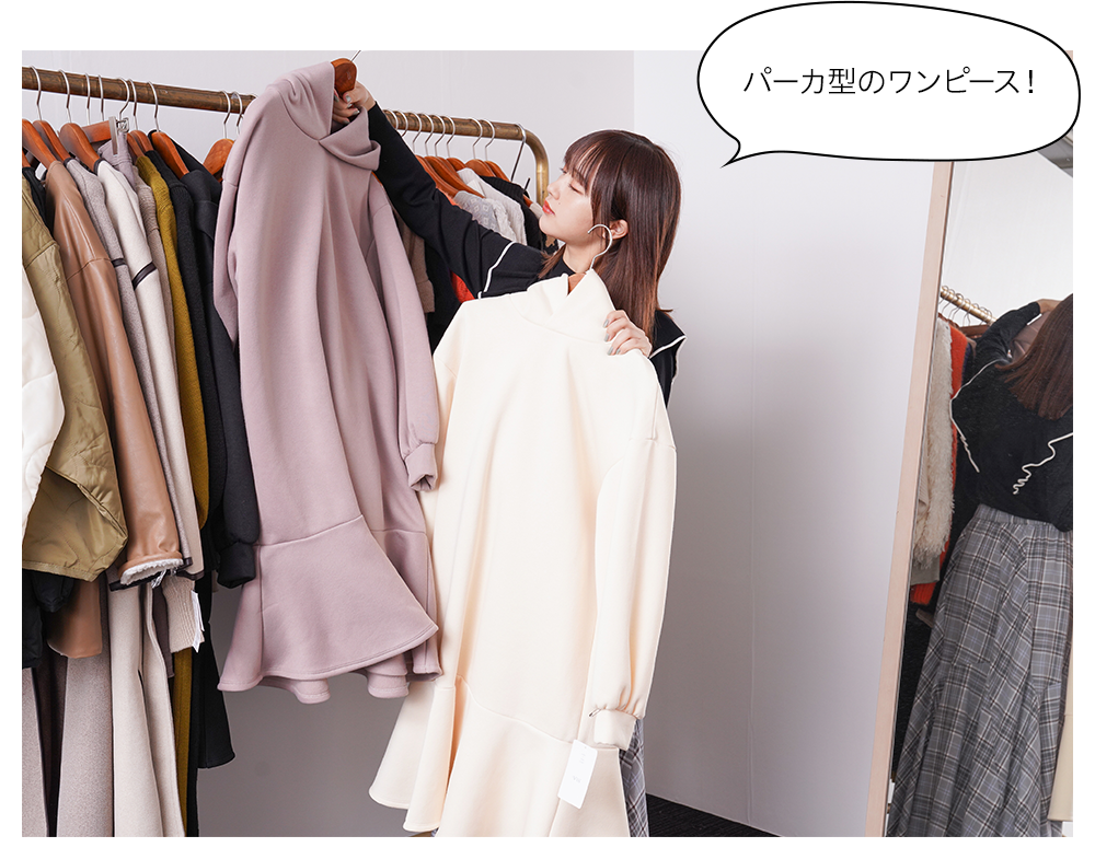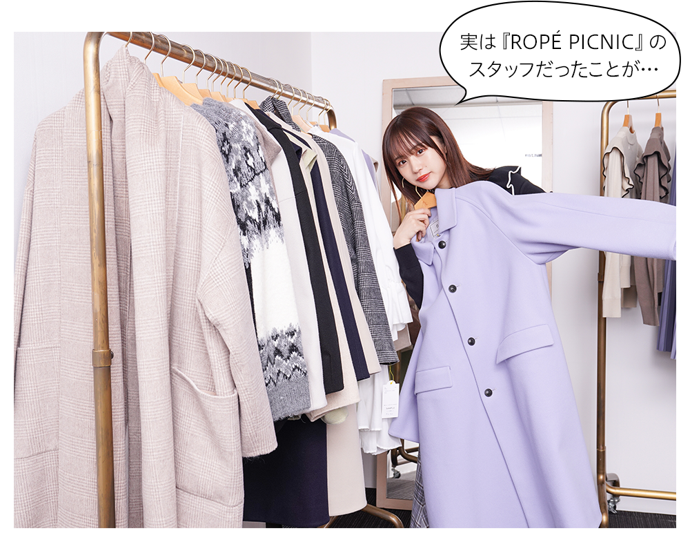 『ROPÉ PICNIC』のショップスタッフの経験があるなえなのさん。「今回はパステルカラーが多くて可愛いですね! あまり奇抜な色は着ないので、こういう可愛さのあるカラーは好き。あと、自分が働いていた時にはなかったような、進化した2WAY、3WAY のアイテムもあって、すごいなーと思いました(なえなのさん)」。