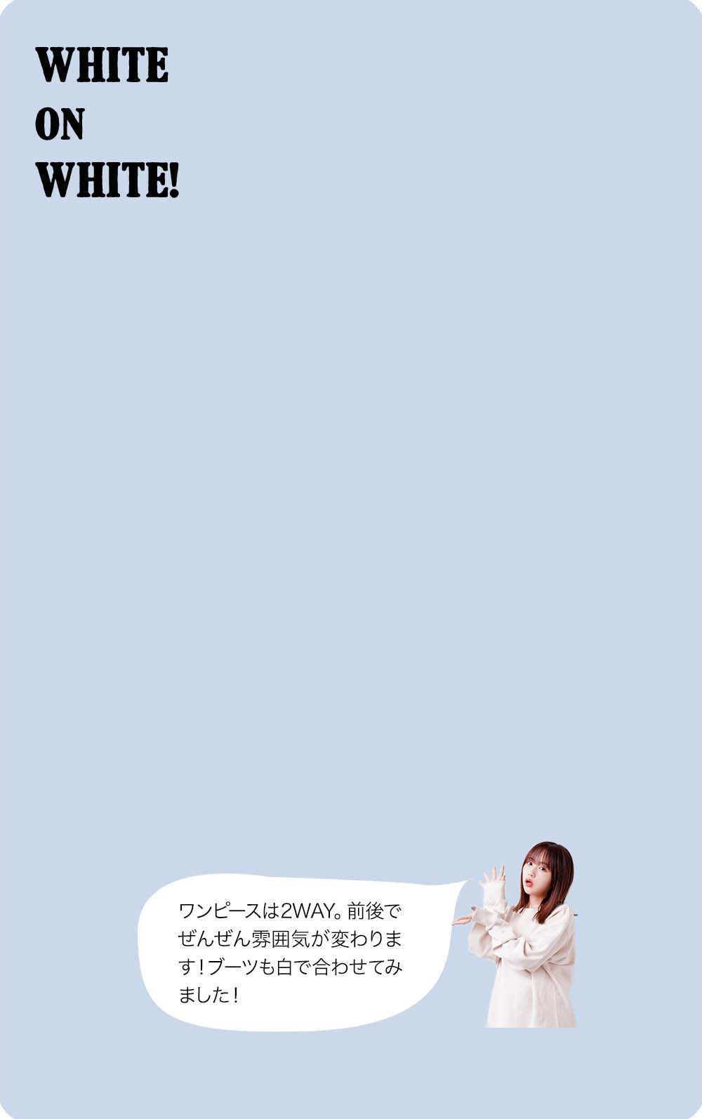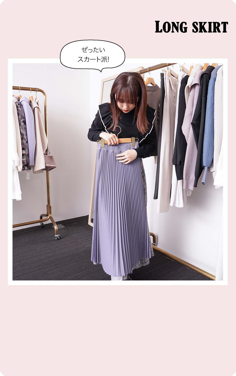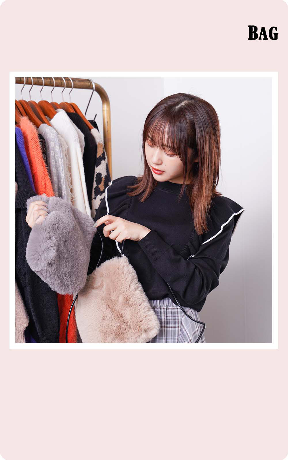 『ROPÉ PICNIC』のショップスタッフの経験があるなえなのさん。「今回はパステルカラーが多くて可愛いですね! あまり奇抜な色は着ないので、こういう可愛さのあるカラーは好き。あと、自分が働いていた時にはなかったような、進化した2WAY、3WAY のアイテムもあって、すごいなーと思いました(なえなのさん)」。