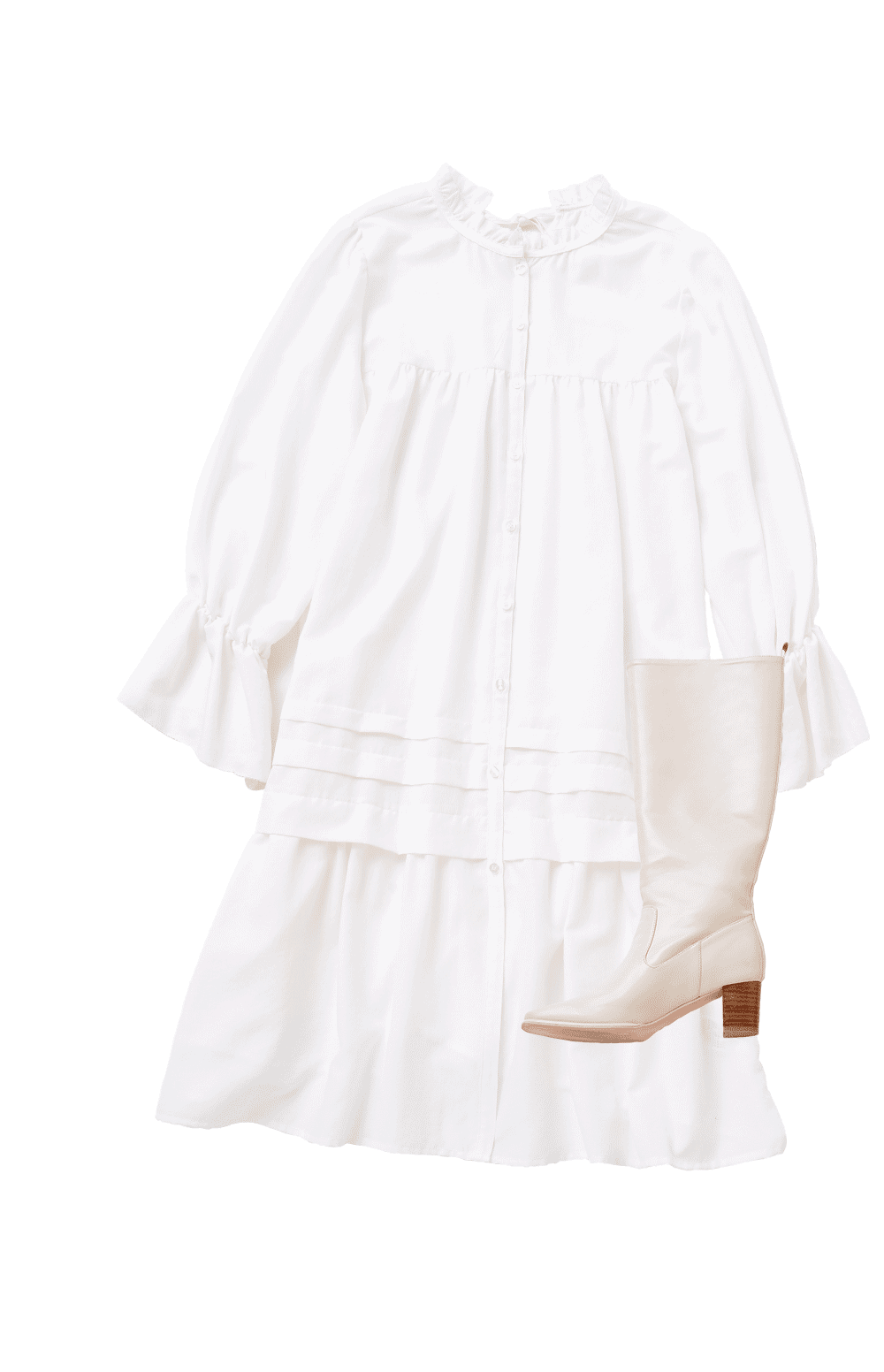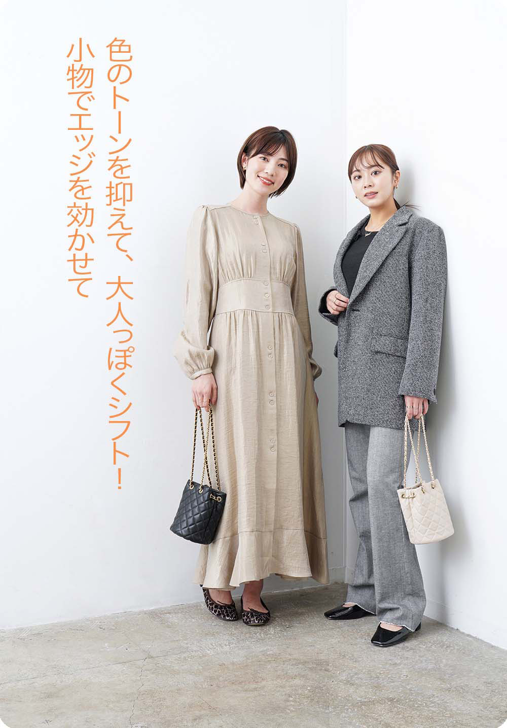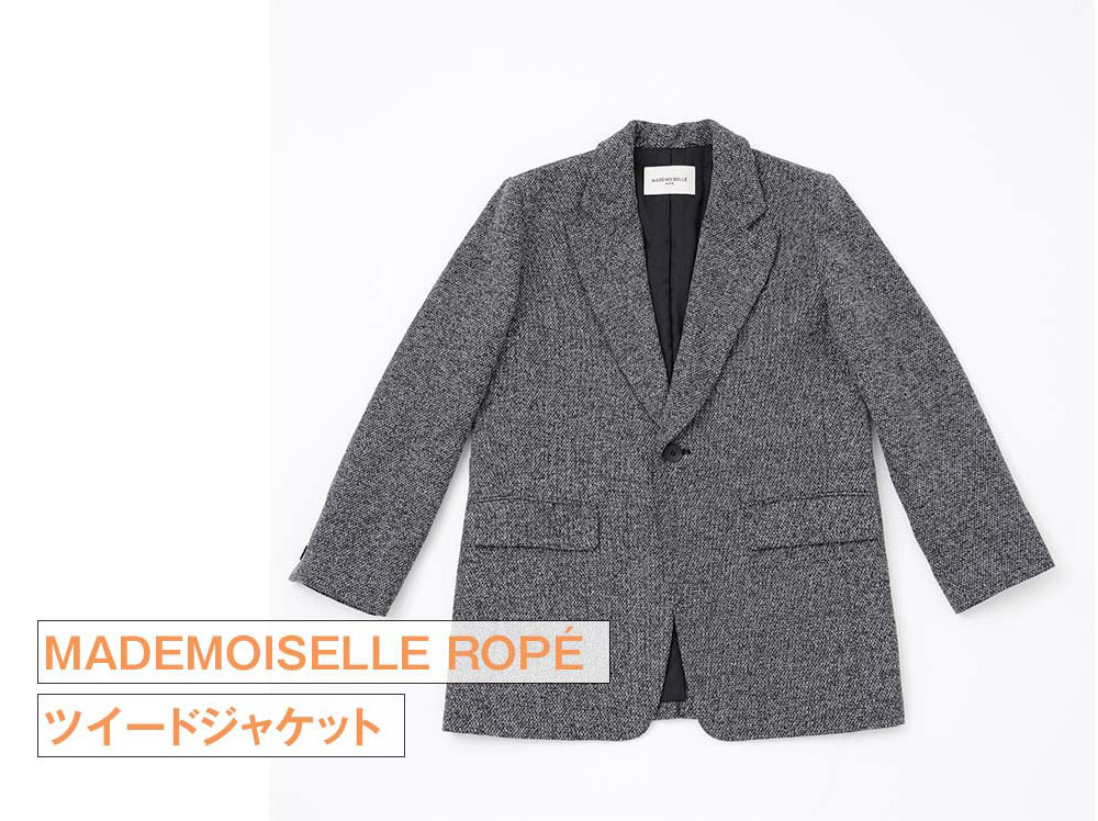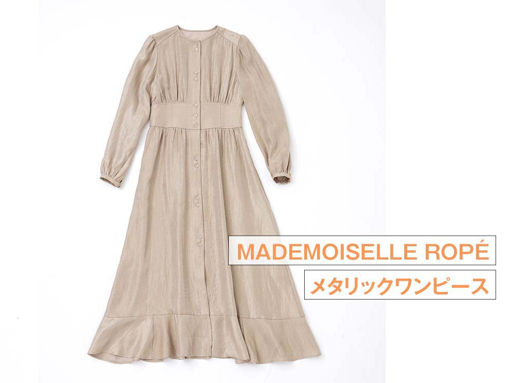 キレイなウエストシェイプと、メタリックな光沢が特長のワンピースは、羽織ってガウンのように着こなすことも可能です。ツイードのジャケットは、大きめのシルエットでお尻がすっぽり隠れるサイズ感。どちらもレイヤードを楽しめて、スタイリング次第で雰囲気を変えられるところがポイントです。