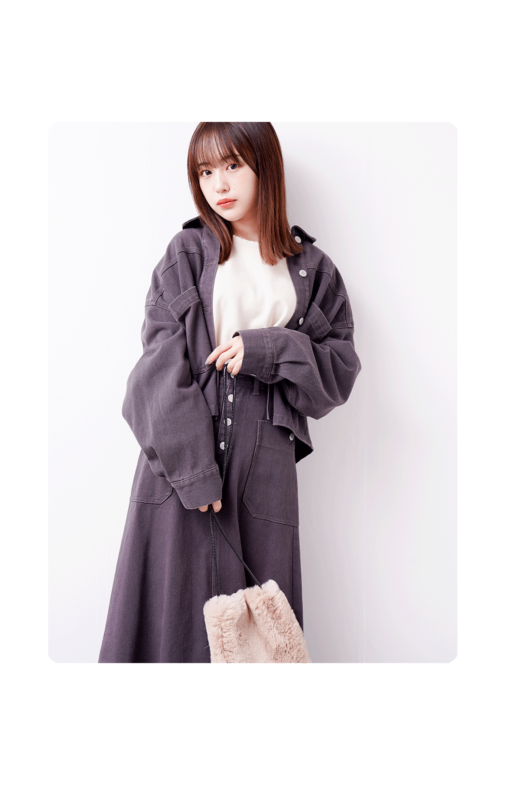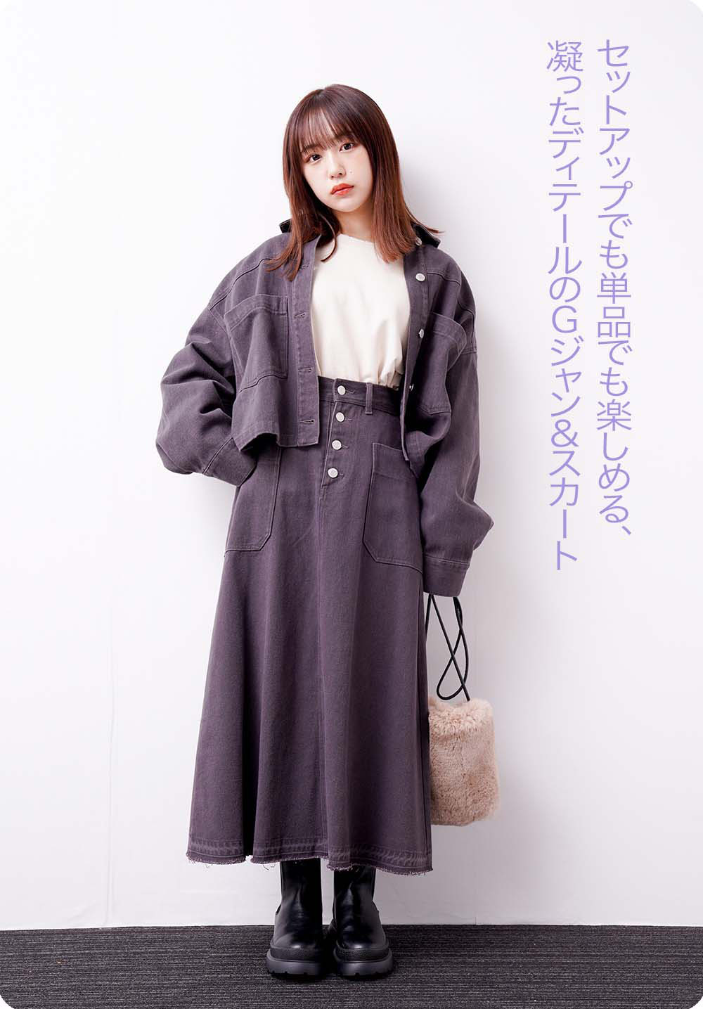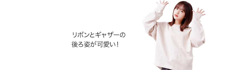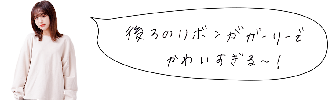 Gシャンは襟をぬいて着ても、前を閉じて着ても決まるデザイン。背中のギャザーと大きめのリボンがポイント! セットアップで着られるスカートは、ハイウエストでAラインの今年らしいシルエット。大きめのポケットや、スソのフリンジがカジュアルで可愛い!