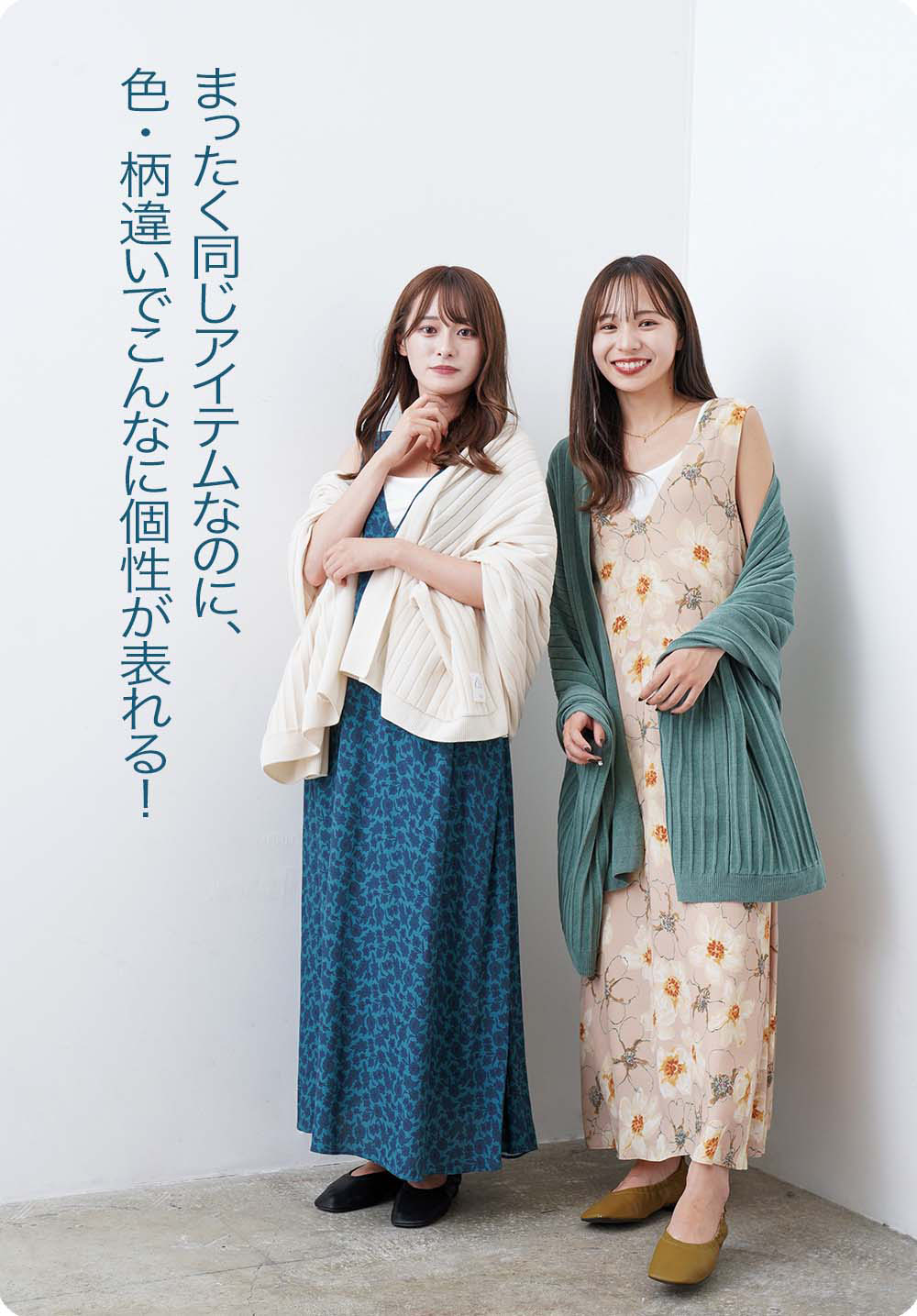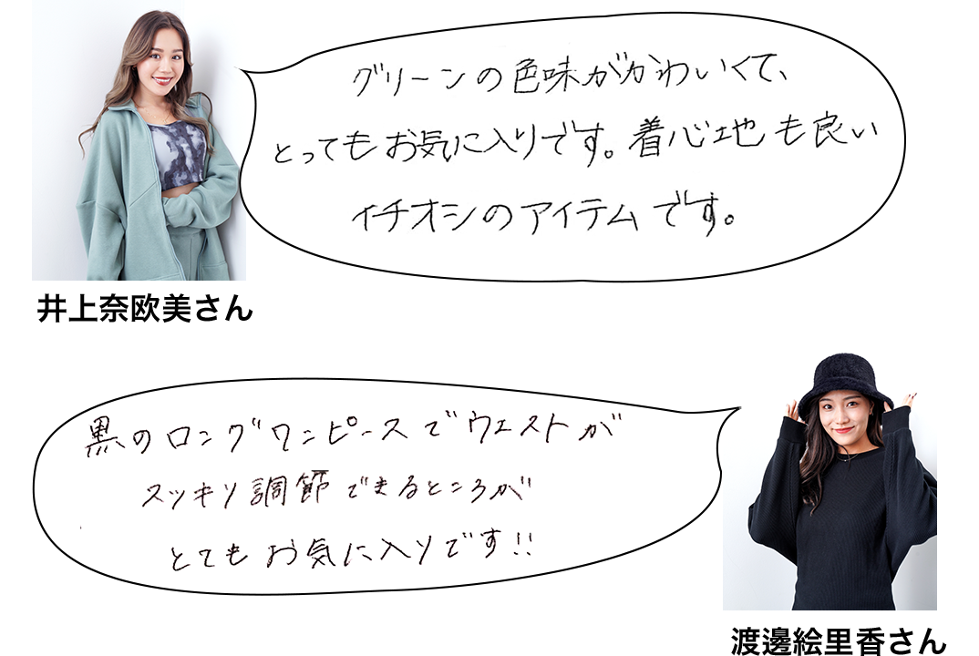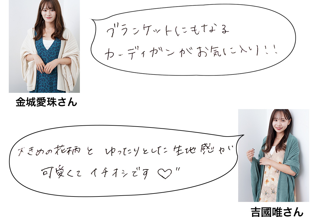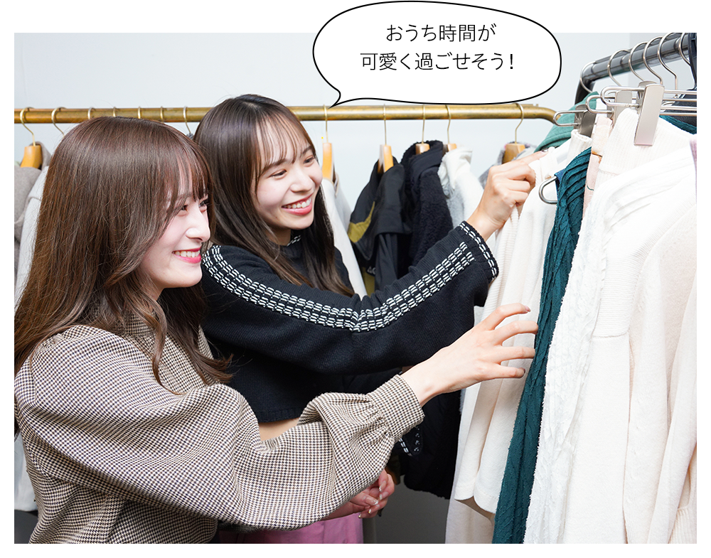 金城愛珠さん(左)、吉國唯さん(右)は、キュートなルームウエアや、くつろげるラウンジウエアなどが人気の『SALON』からセレクト。部屋で過ごすおうち時間がまだ続きそうなこの冬にぴったりの、着心地のよいアイテムが揃います。