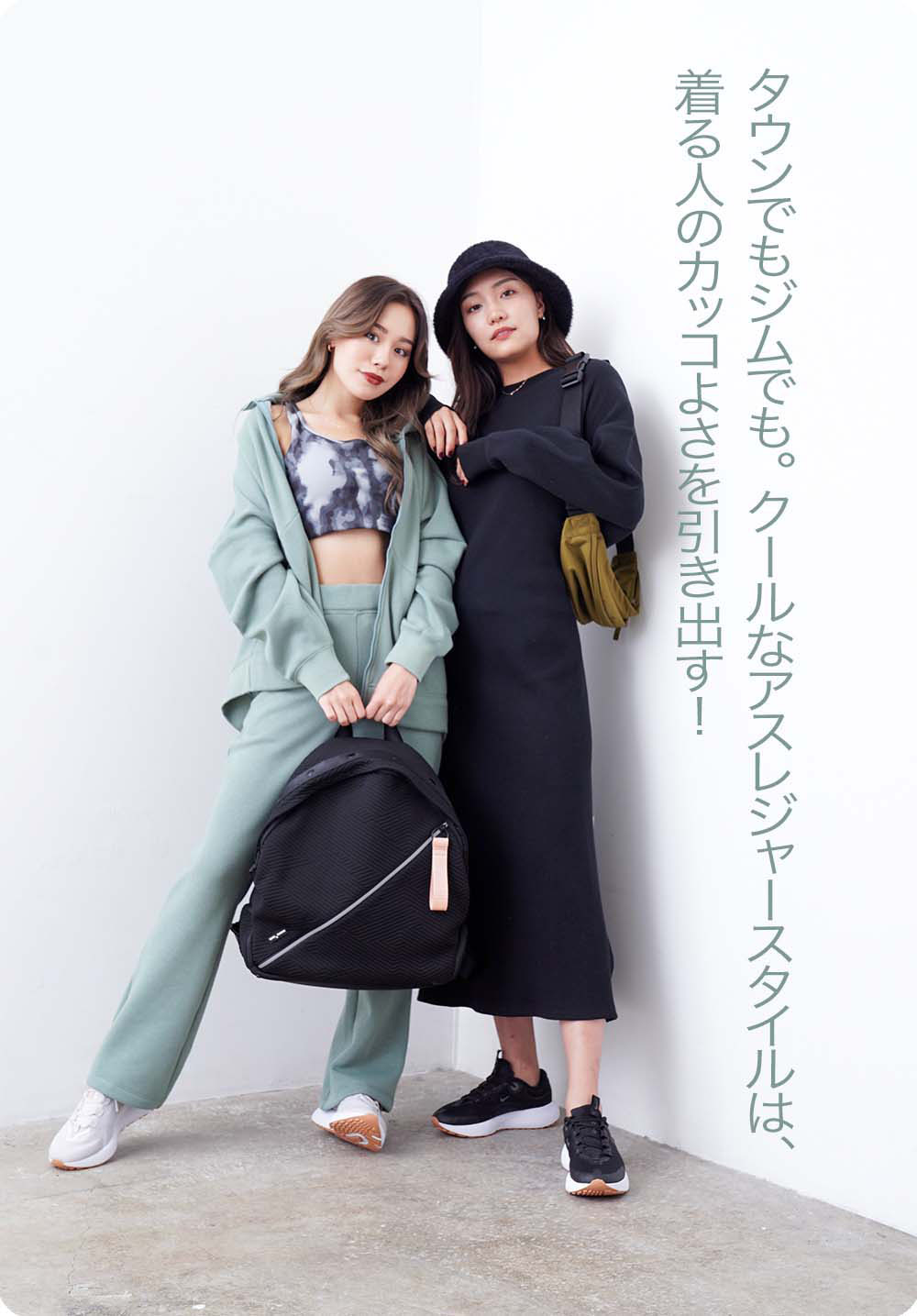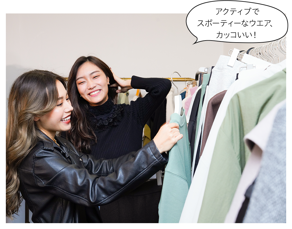 井上奈欧美さん(左)と、渡邊絵里香さん(右)は、『NERGY』のアイテムをセレクト。スポーツウエアやヨガウエアをファッションにも取り入れる『NERGY』のスタイルは、アクティブな2人にぴったり!「かわいくて迷う!」と悩んでくれました。