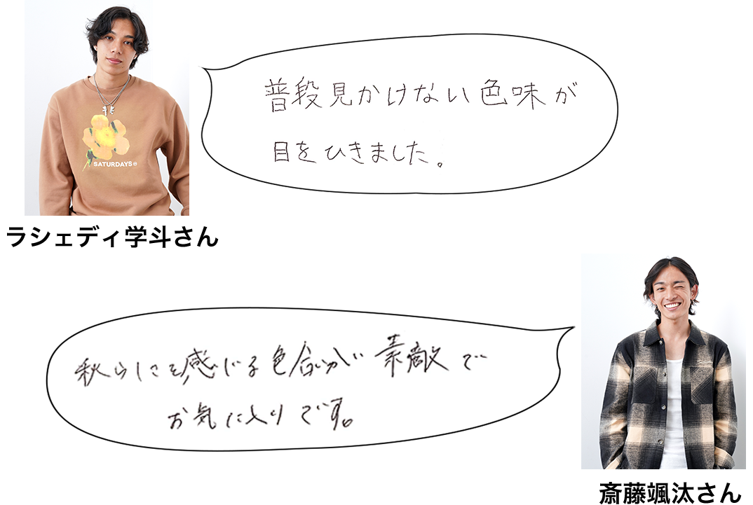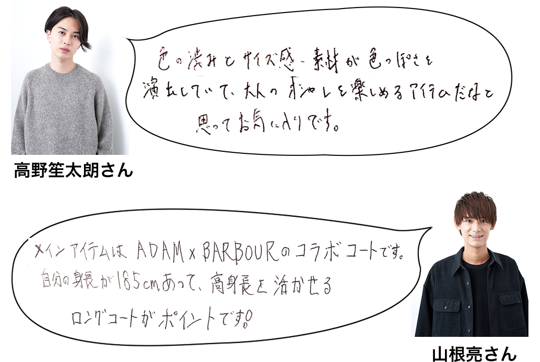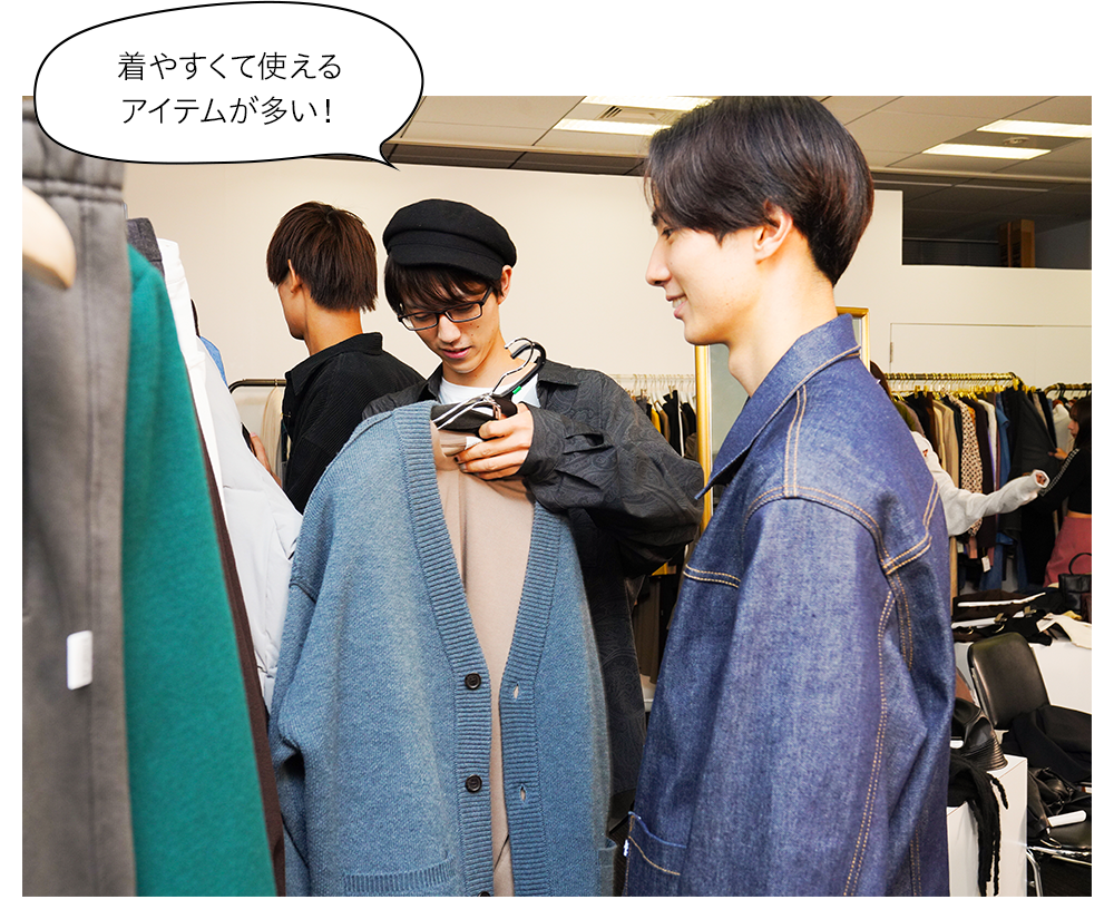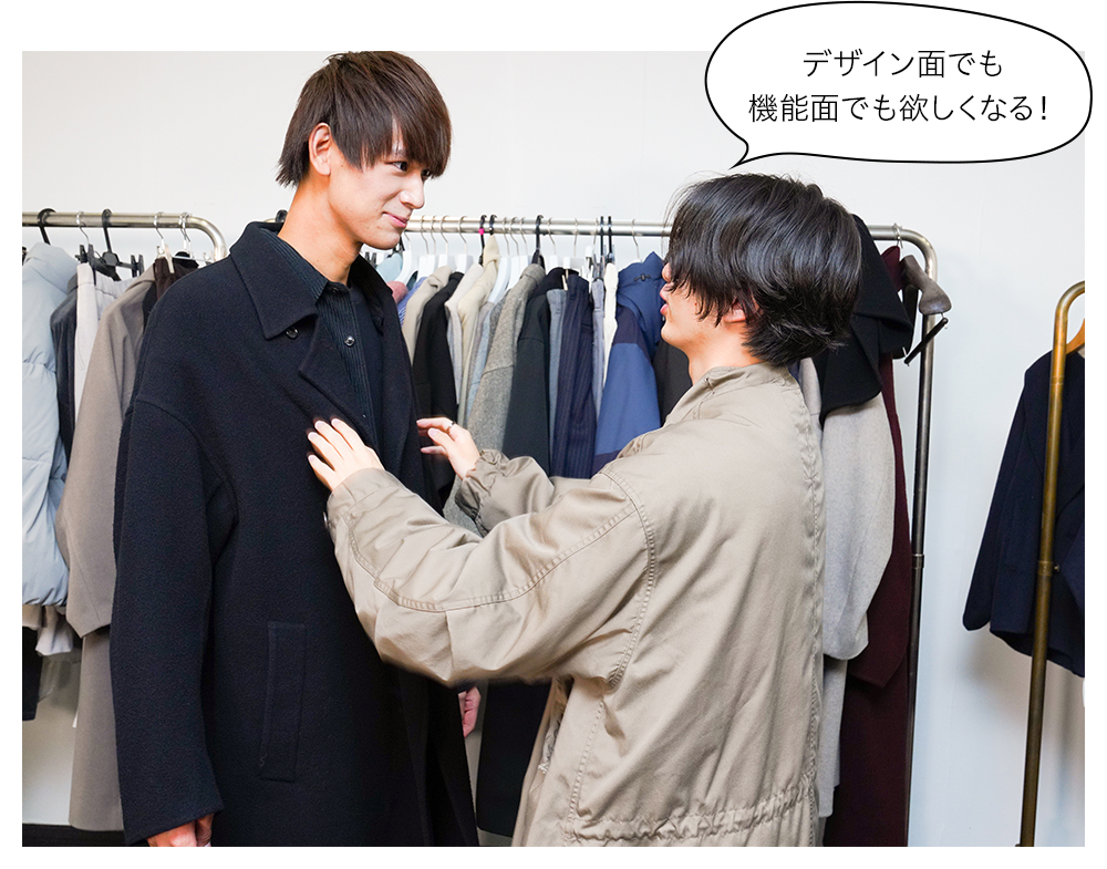 山根亮さん(左)と、高野笙太朗さん(右)は『ADAM ET ROPÉ』をセレクト。ふだんから注目しているブランドとのことで、いろいろ試着、お互いにコメントしあっていました! アウターは機能面もくまなくチェック。