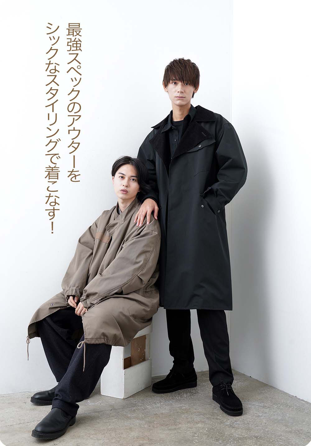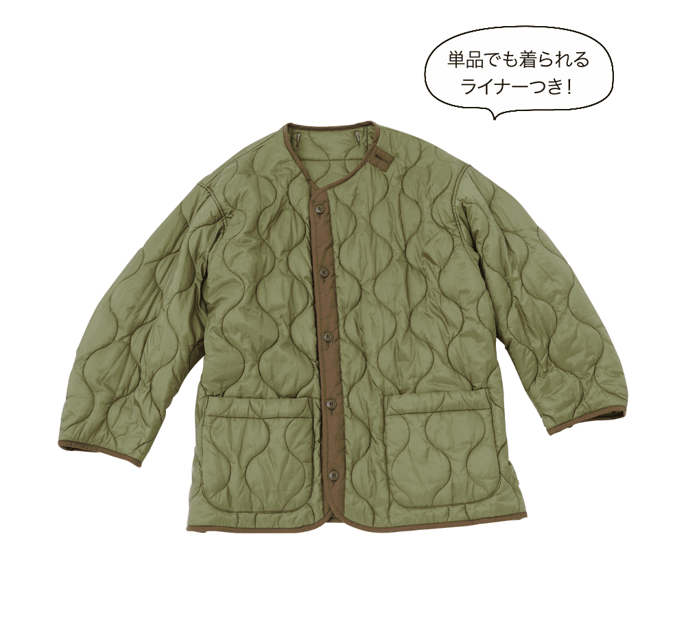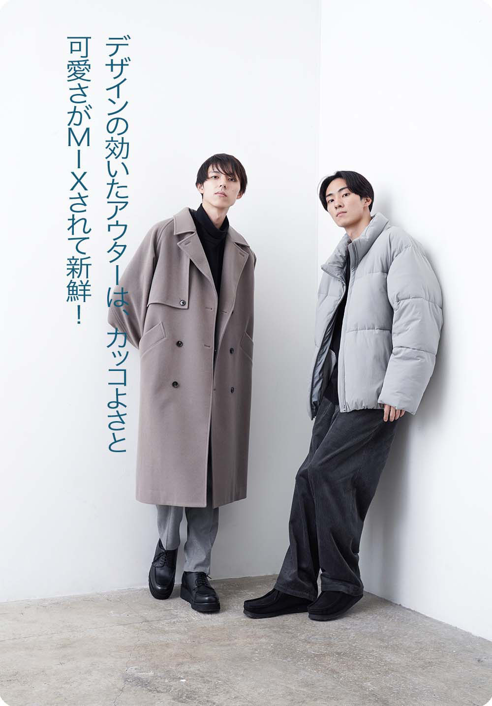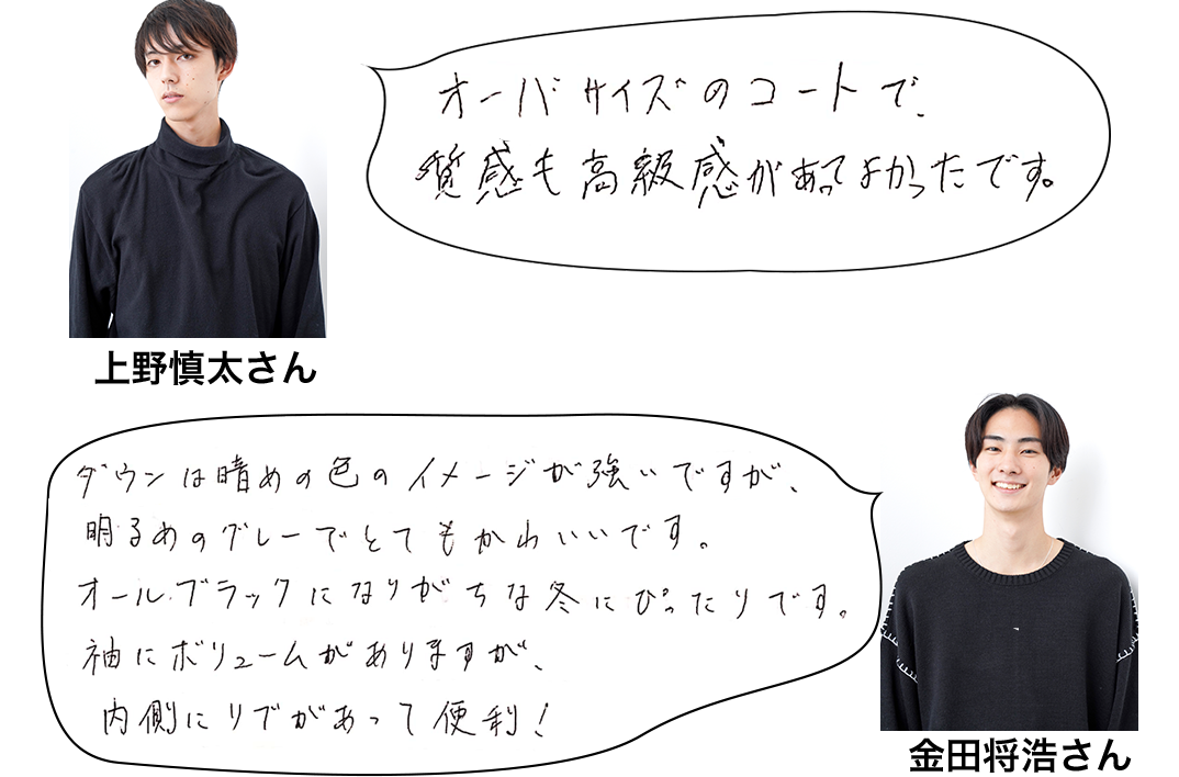 コスパ最高の、ファイバーダウンとコート。それぞれデザインも凝っていて、ディテールも工夫されているのがすごい! ファイバーダウンは驚きの税込一万円以下。二人とも、暗めのボトム&インナーに合わせるのにも便利な、明るめのカラーをセレクト。