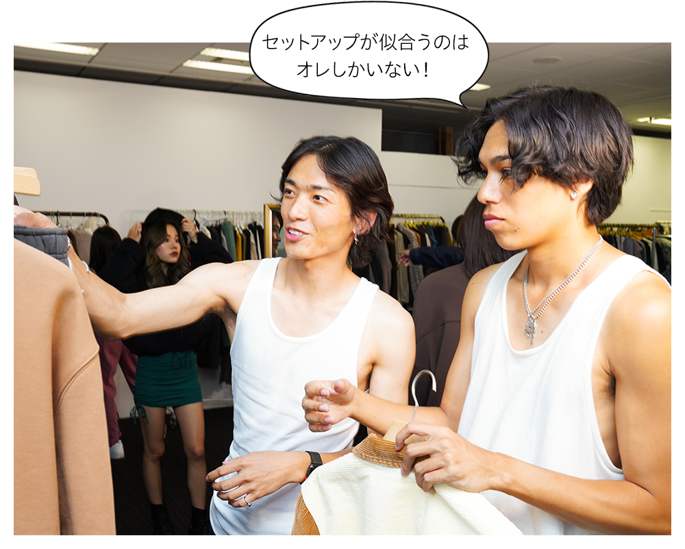 「好きなブランドだ!」と、試着する気まんまんの斎藤颯汰さん(左)とラシェディ学斗さん(右)。海と都会を自由に行き来するライフスタイルブランドに、イメージがぴったりの2人! いろんなコーディネートを考えてくれました。