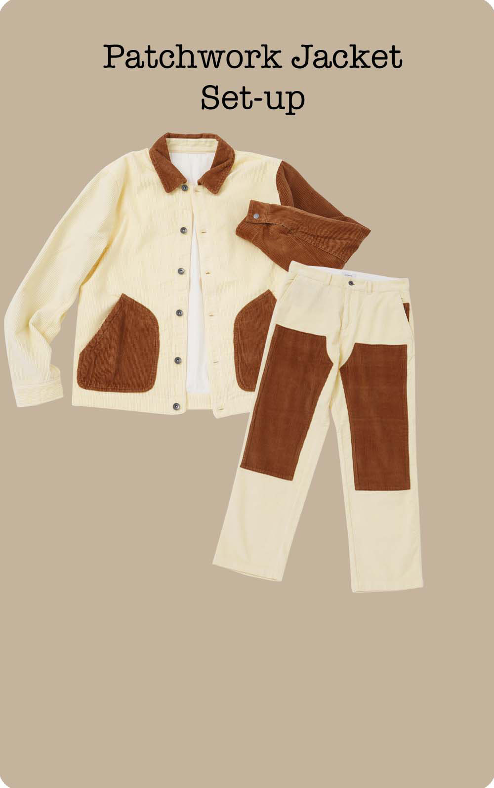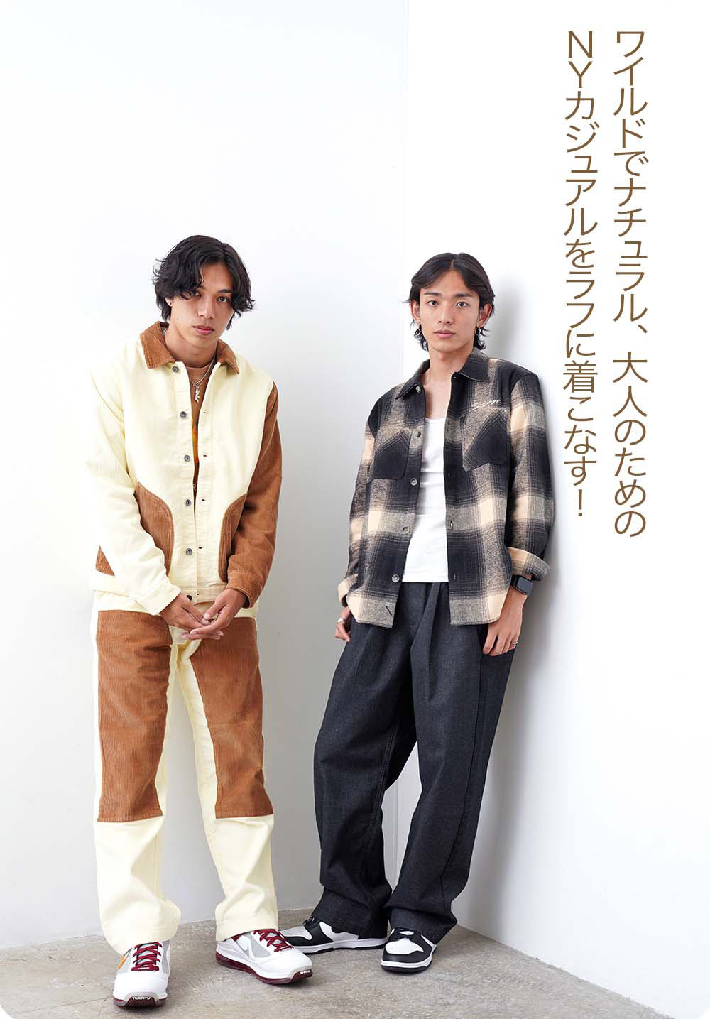 ちょっとクセのあるコーデュロイのセットアップは、「これが着こなせるのはオレ以外にいない」と、ラシェディさんが担当。フランネルのワークシャツは、二人とも気に入っていた一枚。どちらも大人のための、力の抜けた上質カジュアル!