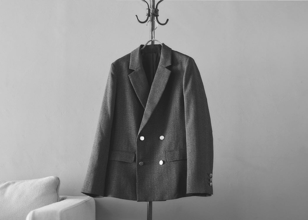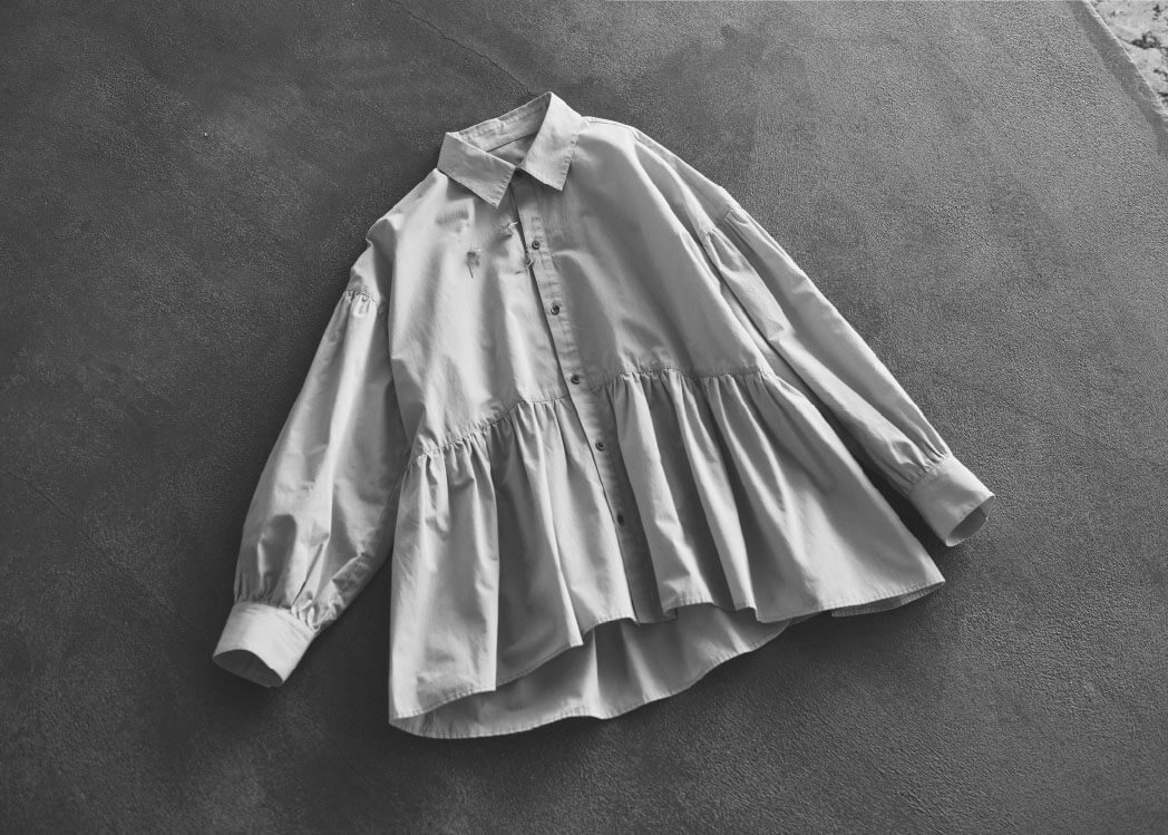 一枚で着てもサマになり、羽織にしても、上にベストやビスチェを重ねても楽しむことができるオールマイティなシルエットが魅力。ゆえに、シーズンを超えて着回すことを可能にした。裾は前後差をつけることでヒップやお腹まわりを自然にカバーする。ハリ感のある地厚な素材のため、ホームケアをしやすいのもポイントだ。今日はソファに腰掛けて話題の映画について長電話。会話のリズムにのって、気の向くままにお気に入りのブローチを飾ったら、華やかなルックの出来上がり。