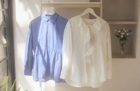 オフィスにも着て行けて、休日のおでかけ着としても楽しめるシャツとブラウス。一枚でも重ねてもサマになり、前後差をつけた長めの裾が腰まわりを自然にカバーする。(写真左) ウエストのギャザーが着こなしにニュアンスを添える「ペプラムシャツ」。綿とポリエステルによるハリのある素材使いのためホームケアしやすい。ブルーストライプのほかブラック、ホワイト、サックスブルー、ブラウンを用意。UVケア効果もあり。(右) 「ラッフルブラウス」は、襟から前立てにかけてのディテールが、顔周りを華やかな印象にする。レイヤードを楽しみたいときは、フロントリボンをゆるく結んで。ホワイトのほかブラック、ブルーストライプ、ブラウンドットを揃える。
