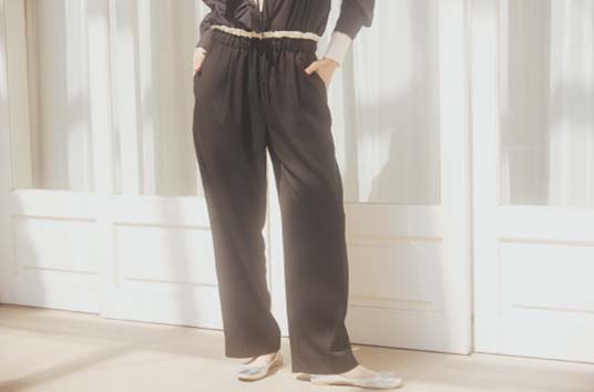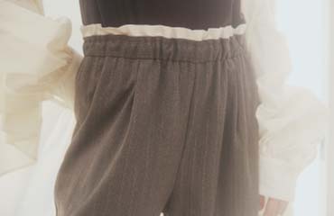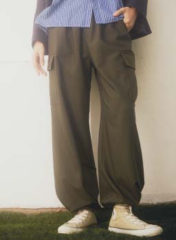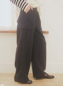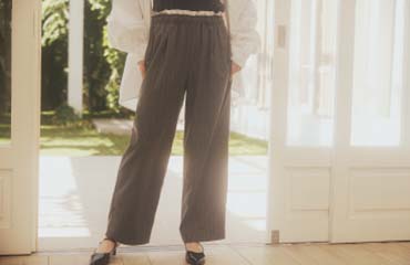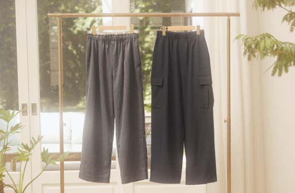 ウエストギャザーながら上品なルックスにこだわった。(写真左)旬なダブルウエストが目を引く「ウエストディテールパンツ」。腰回りにあしらわれた光沢感のある素材使いがフェミニンなムードを盛り上げる。さまざまなボディタイプの方にフィットするように、内紐付きで36、38、40の3サイズを用意。グレーストライプのほか、ブラック、チャコールグレー、キャメルの展開あり。(右) 「イージーカーゴパンツ」は、フロントの一部をフラットにすることで、前立てのあるボトムスの雰囲気に近づけた。裾はドローストリングでボリュームをコントロールすることが可能。こちらも3サイズ展開、ネイビーのほか、カーキ、チャコールの3色で登場。