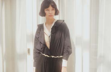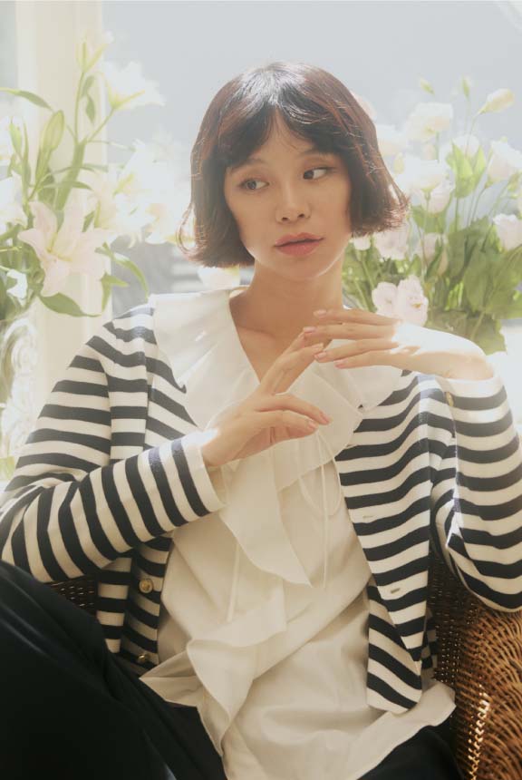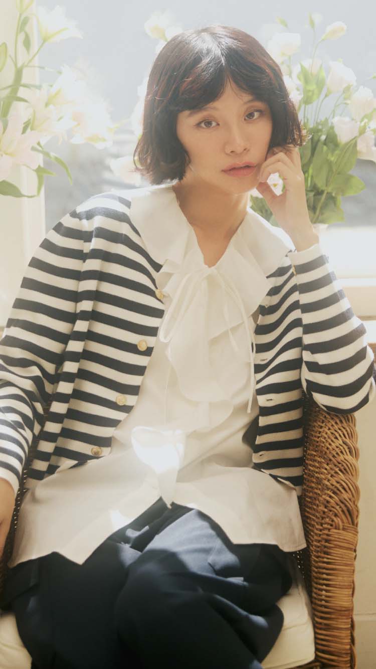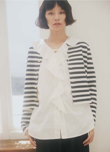 大人になってもリボンにときめく心は変わらない。「ラッフルブラウス」は、フロントの華奢なリボンをタイトに結んだ王道のスタイルで着て。肌寒い季節に重宝するボーダーのカーディガンとネイビーの「イージーカーゴパンツ」をセット。カジュアルな要素をミックスしても、落ち着いた色味に気を配ると、レディな装いにまとまる。柔らかな光を背景に、窓際で芳しい花の香りに包まれて。