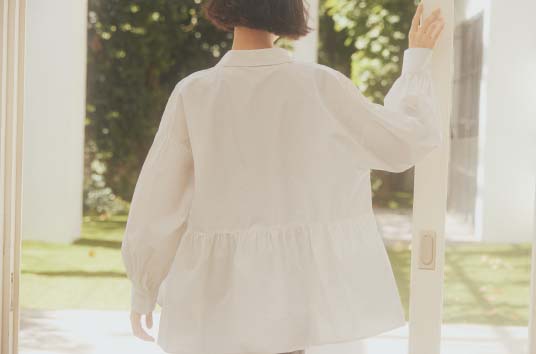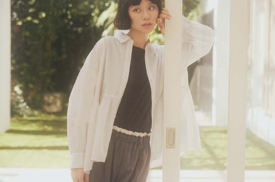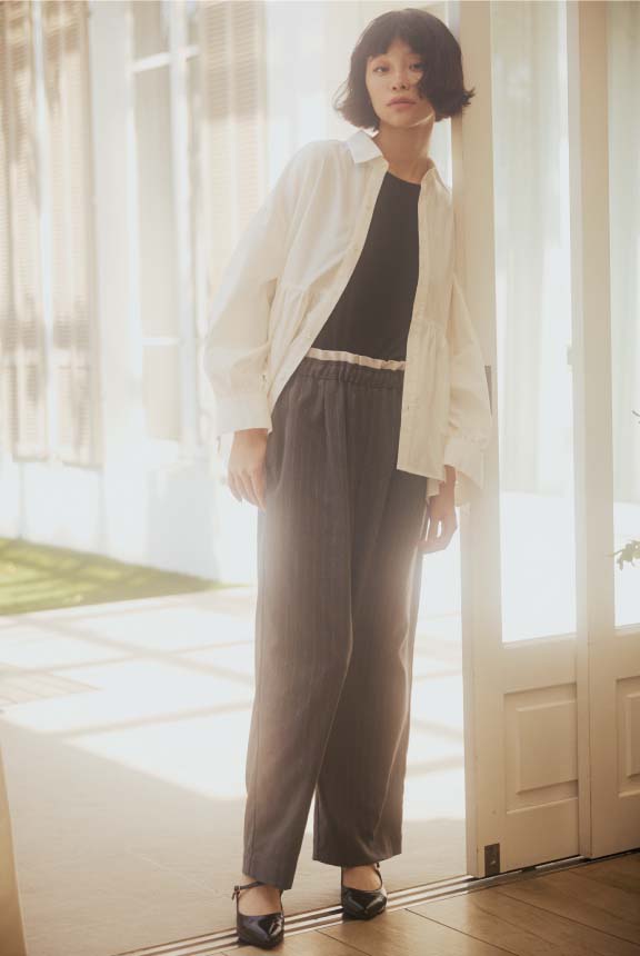 秋はおしゃれもアップデートしたくなる季節。慣れ親しんだシャツとパンツの装いをフレッシュにするヒントは“立体感”にあり。ラフに羽織った「ペプラムシャツ」は、ギャザー使いがシンプルさのなかにひとさじの遊び心を添える。旬なボトムスのレイヤードが1着で叶う「ウエストディテールパンツ」を合わせたら、こなれたアンニュイさが加わった。今こそ、ベーシックウェアに磨きをかけて。