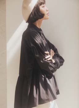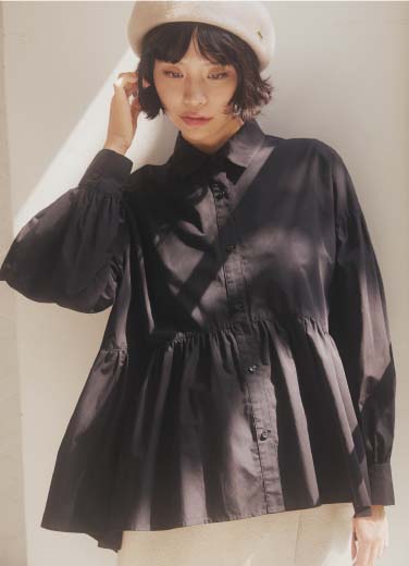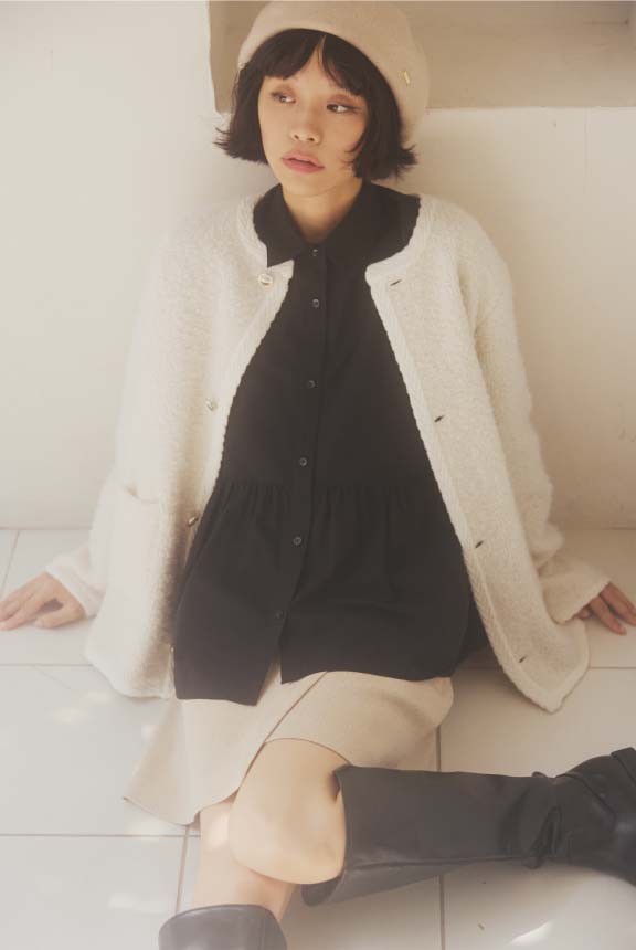 朝晩で気温差に翻弄される時期は何を着るのが正解? マットな質感が際立つブラックの「ペプラムシャツ」は前立てのボタンをすべて閉めて着て。その上から、着脱しやすいループ編みのカーディガンをオン。引き続きトレンドのミニスカートとロングブーツの組み合わせに、フレンチシックなムードを盛り上げるベレー帽を。きちんと感がありながら、季節に対応する心地いいスタイルが完成する。
