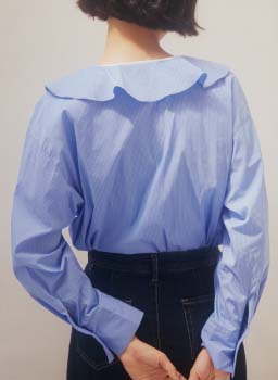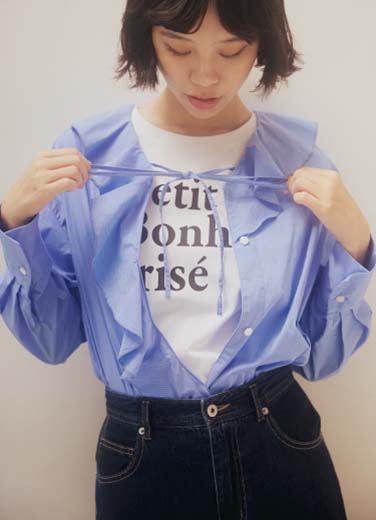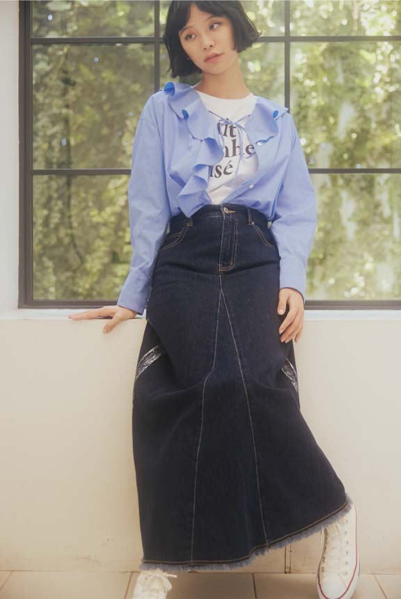グラフィックTシャツに「ラッフルブラウス」を重ねた遊び心のあるスタイリングもおすすめ。前立てのボタンは開けた状態でスカートにインし、ネックのリボンは余裕をもたせて結んで。ボトムスに選んだフレアシルエットのデニムスカートは、両サイドにあしらわれた箔プリントのラインがモダンなアクセントを添える。インディゴブルーの深い色合いが、シーズンレスで着られるシャツを秋めく表情に。