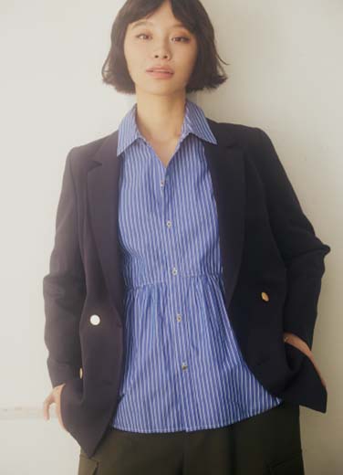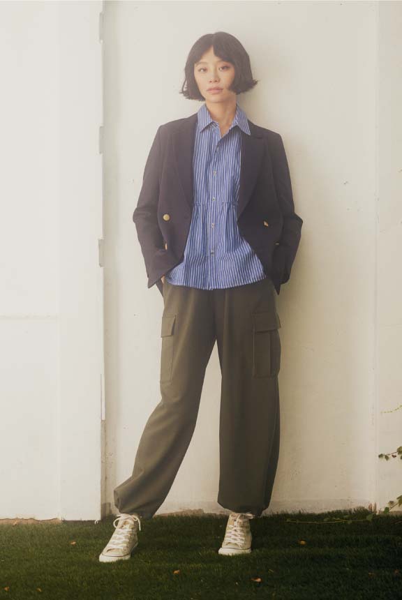 オーセンティックなアイテムとともに、レイヤードが楽しくなる、秋のおしゃれマインドに火をつけて。爽やかなブルーストライプの「ペプラムシャツ」は、ボタンを2つ開けて抜け感を。裾を絞ったカーキの「イージーカーゴパンツ」でカジュアルな味付けをしたら、ジャケットに袖を通して。ウエストになだらかなカーブをかけたシルエットのため、スニーカーの足元でも上品にまとまる。