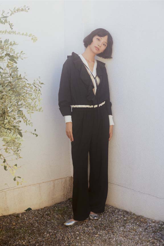 エクリュのブラトップに同系色のシアーカーディガンを重ねたら優美な「ラッフルブラウス」をオン。インナーを胸元や袖からのぞかせたら、腰回りのあしらいが心地いい色の調和をもたらす「ウエストディテールパンツ」を履いて。足元はトレンドのシルバーカラーのバレエシューズで軽やかに。異素材を効果的に取り入れることで、ダークトーンを基調にした肌見せがぐっとこなれて見える。