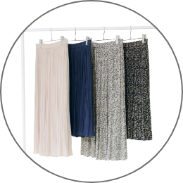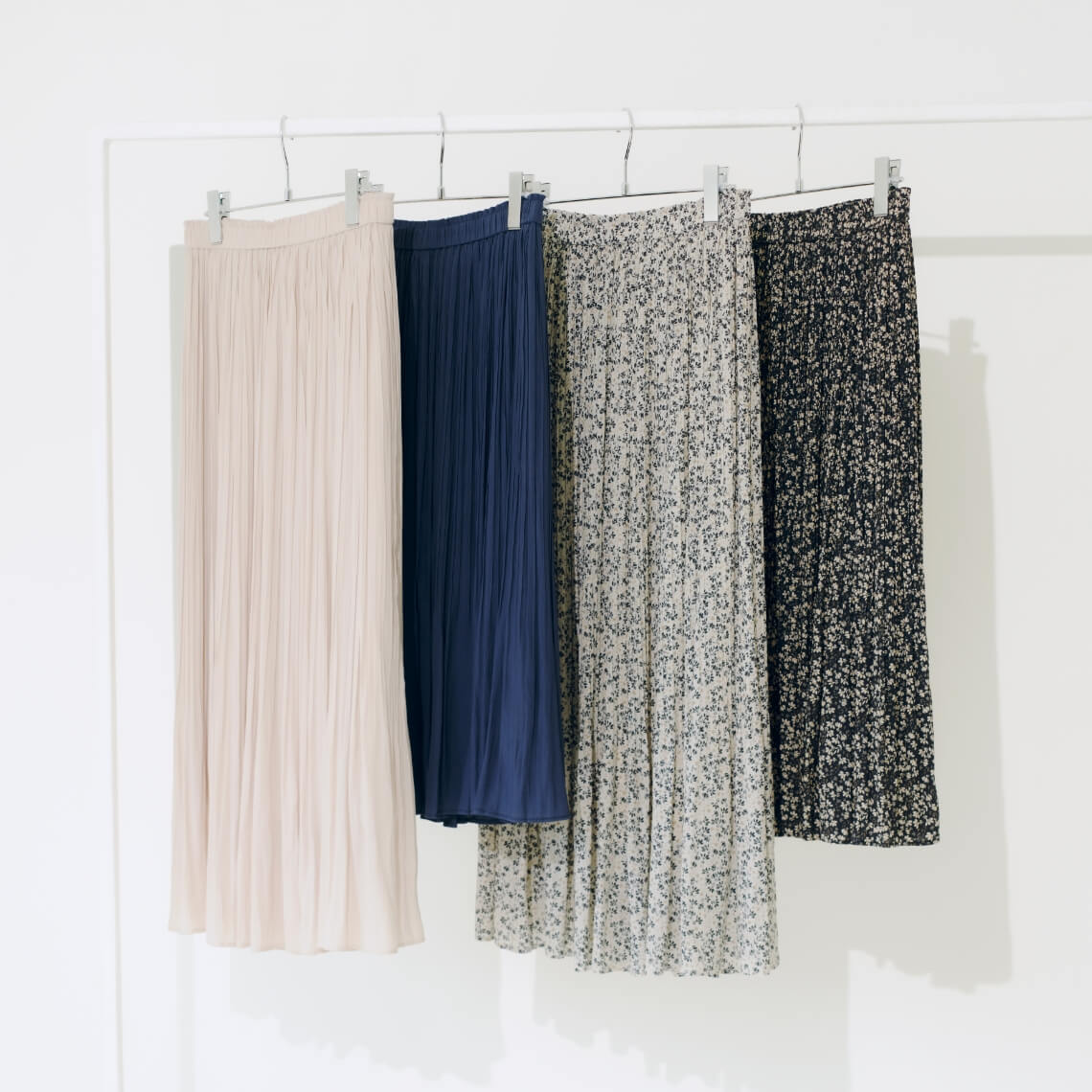 「シーズンレスに着回せる楽なスカートを作りたいという想いから企画。普段から愛用するほど、理想のアイテムが出来上がりました。どんなスタイリングにも合うので、季節や場所を選ばず着用いただけます。エレガントな花柄も新たに展開中です」