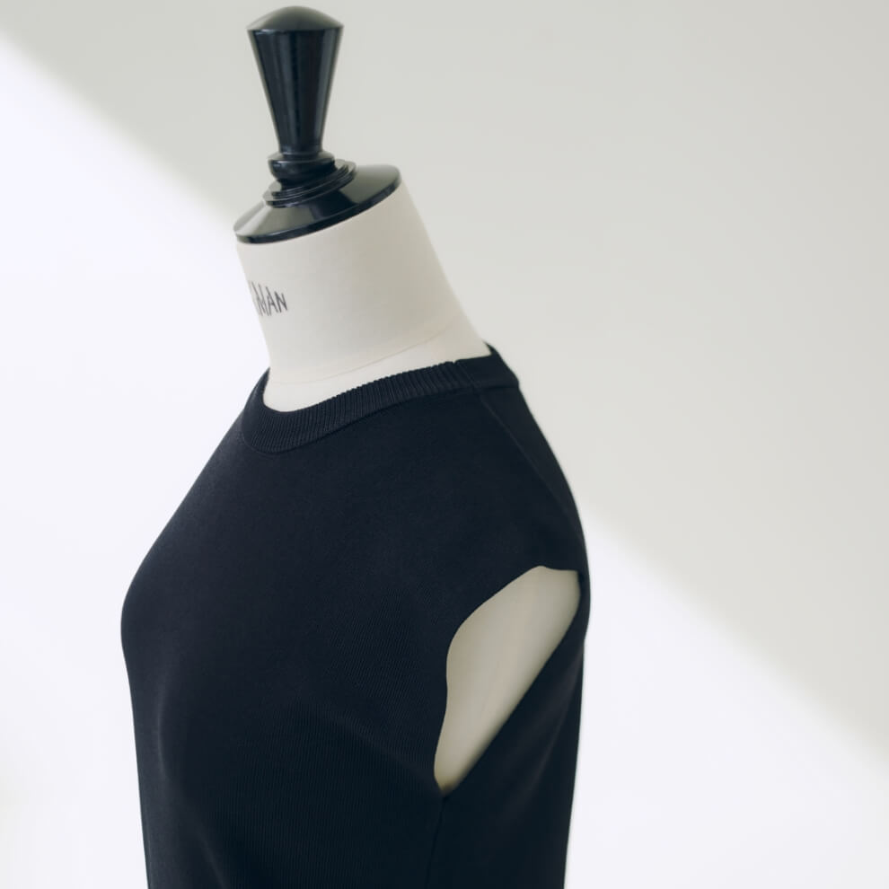 「肩の頂点が隠れるデザインだから二の腕が細く見える」「肩線が後ろにずれていてシルエットすっきり見える」など、ノースリーブが苦手な人でもチャレンジできる要素が詰まった一着。衿幅も程よい太さで、首周りがきれいに見えます。
