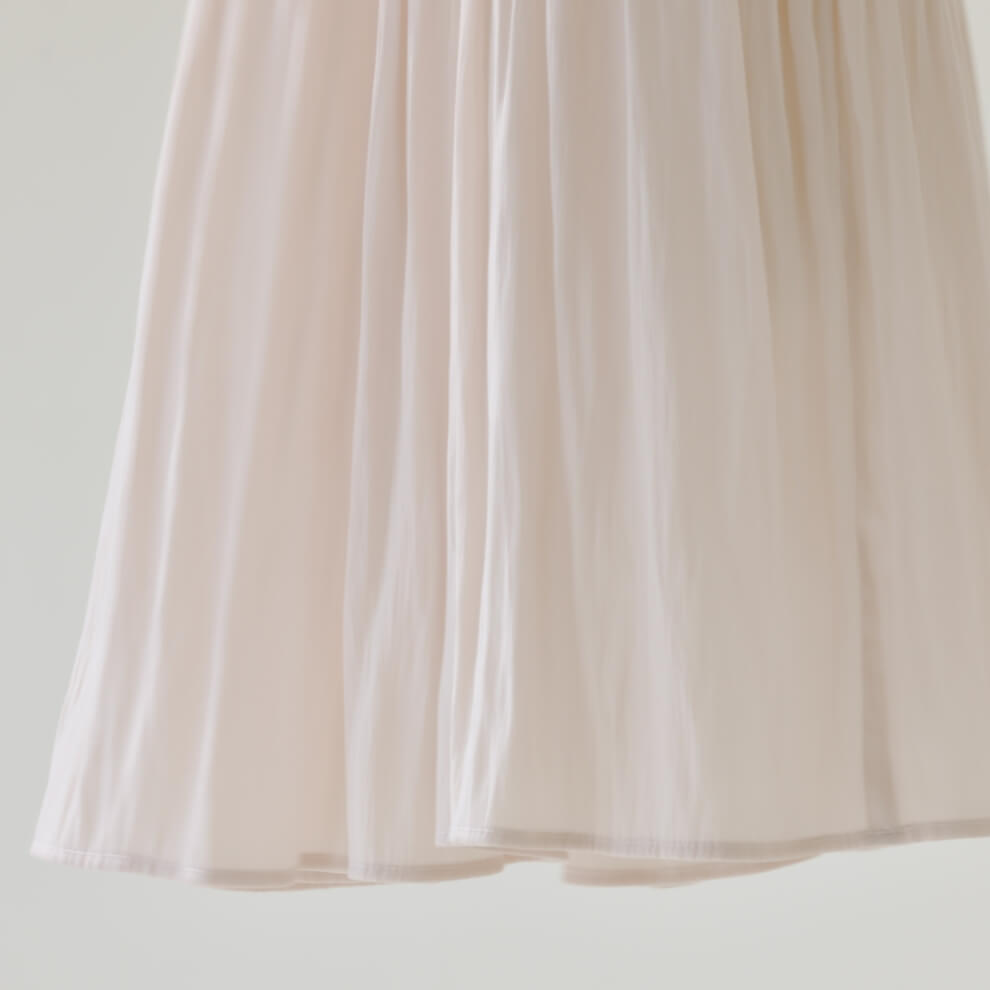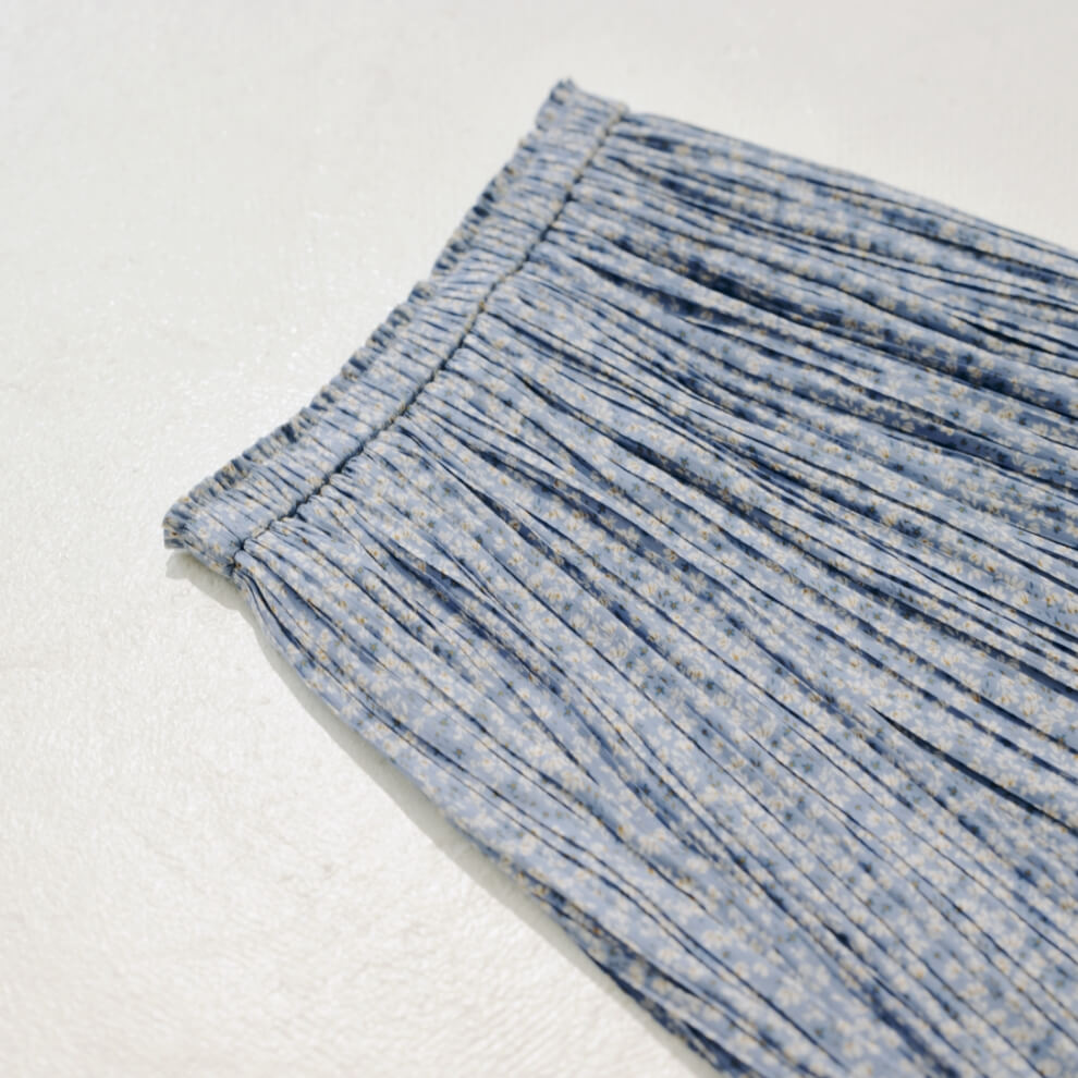 履きやすさを考えたウエストゴムのイージー仕様。フリルのようなデザインなので、トップスをインしてもおしゃれに見えます。裾に向かって広がるプリーツ加工も華やかな印象に仕上げてくれるこだわりのひとつ。