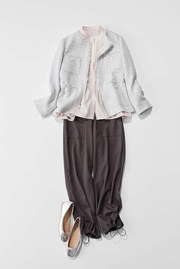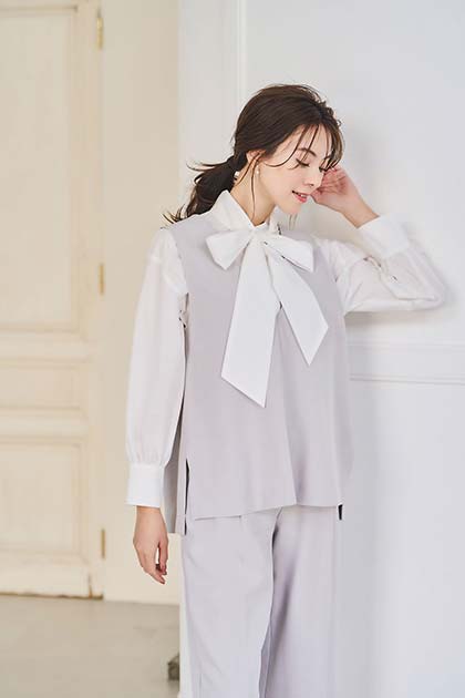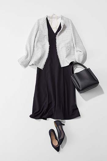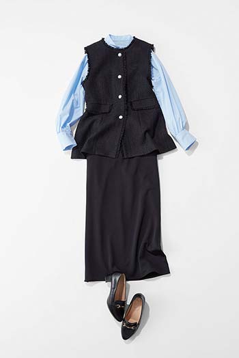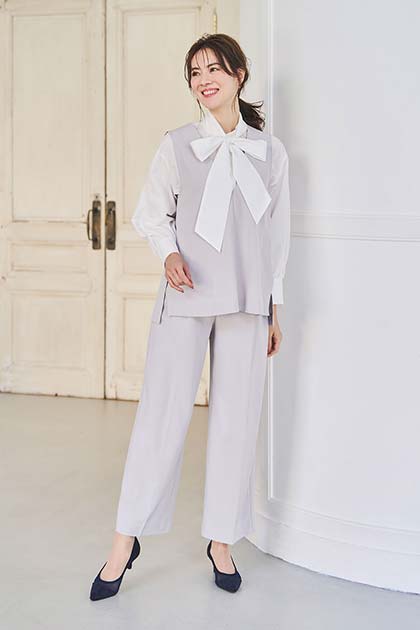 セレモニールックの定番素材、ツイード。軽やかなジレなら、よりトレンド感のある着こなしに。細身のパンツや黒小物でスタイリッシュにまとめつつ、エレガントな大ぶりリボンのシャツブラウスで華やかさもプラス。