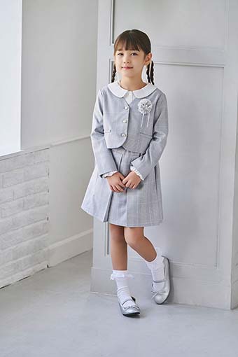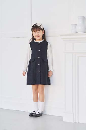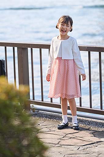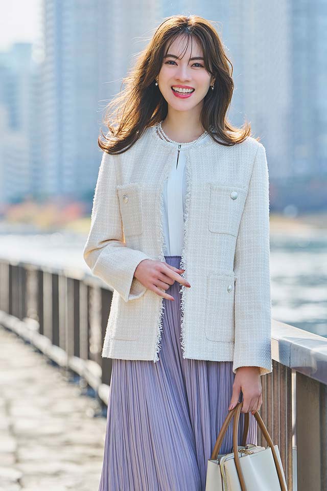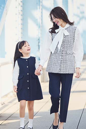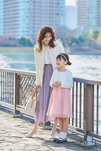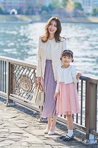 写真映えするラベンダー色のスカートには、羽織るだけで品よくまとまる白のツイードジャケットがマッチ。パステルカラーのスカートやパールのアクセサリーなど、コーディネイトの要所をキッズとリンクさせるのも素敵。