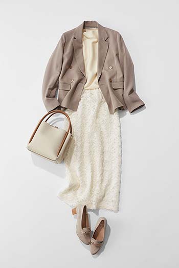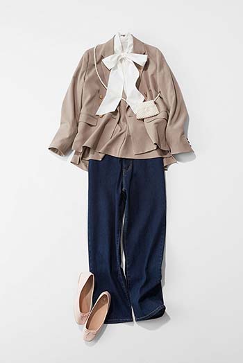 小難しく考えずとも決まるスタイリッシュなセットアップ。端正なネイビーに合わせるのは、上品な質感のタックブラウス。バッグやシューズも柔らかい雰囲気のベージュを選び、ハレの日に適した明るい印象に仕上げて。