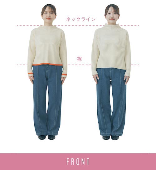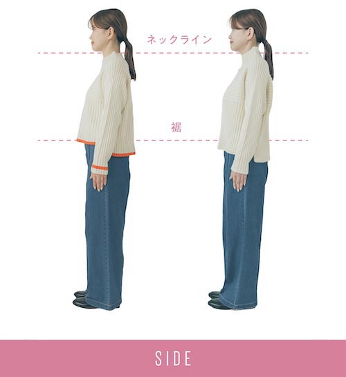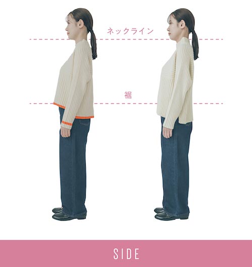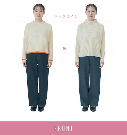 ネックデザインが少し短い仕様のコラボサイズは、首の長さを強調しすっきり見せ効果◎。定番サイズは身体をあまり拾わないゆとりのあるシルエットがうれしい。