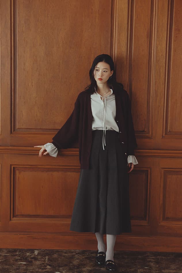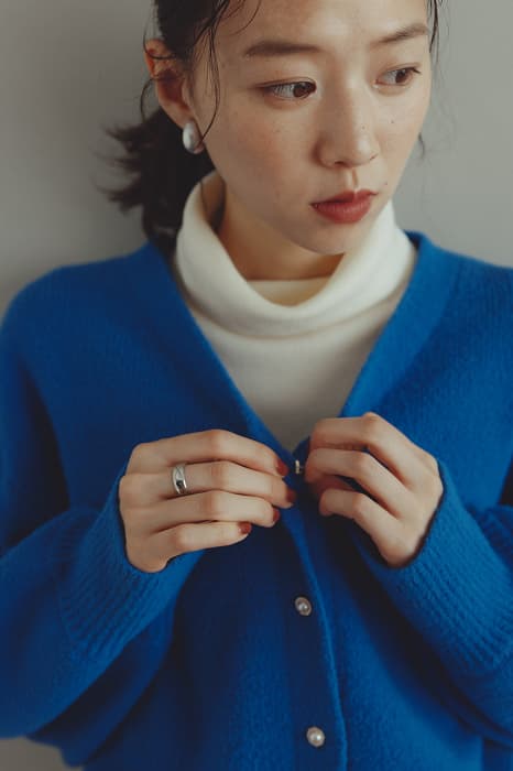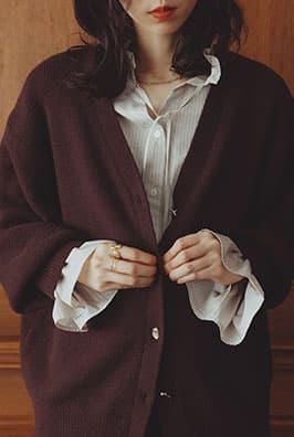 もっちり、ふんわりタッチが魅力のミドル丈カーディガン。変形メタルのボタンの一癖で、アクセサリーいらずの着映える一枚。