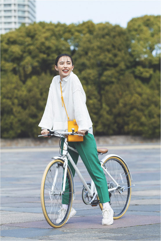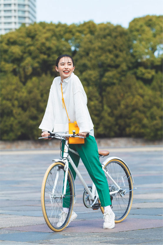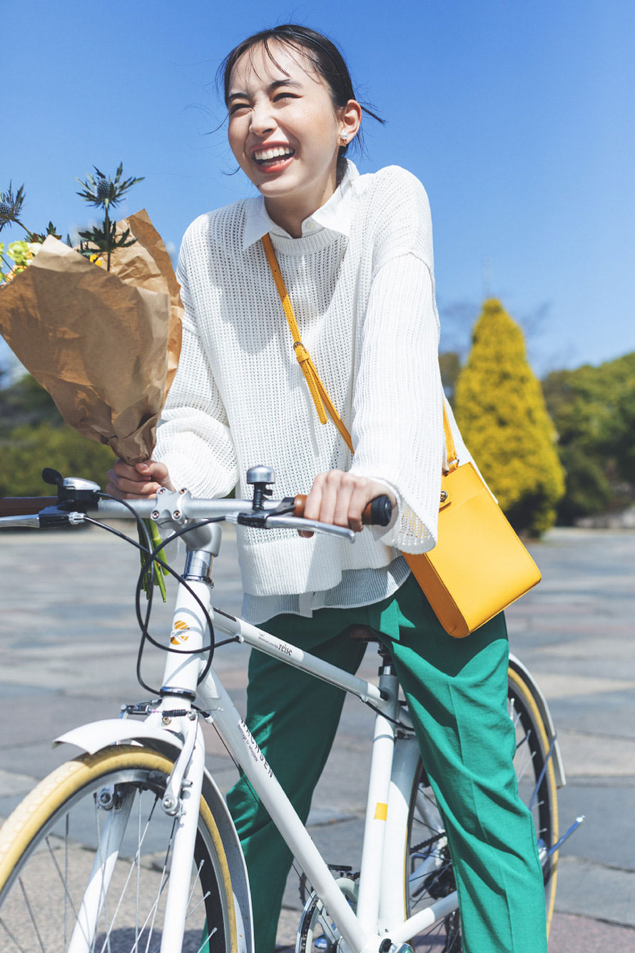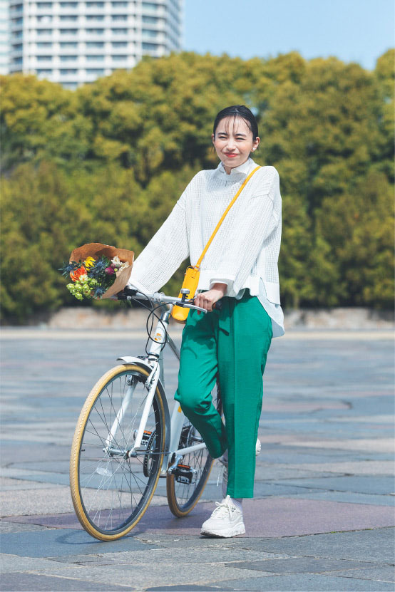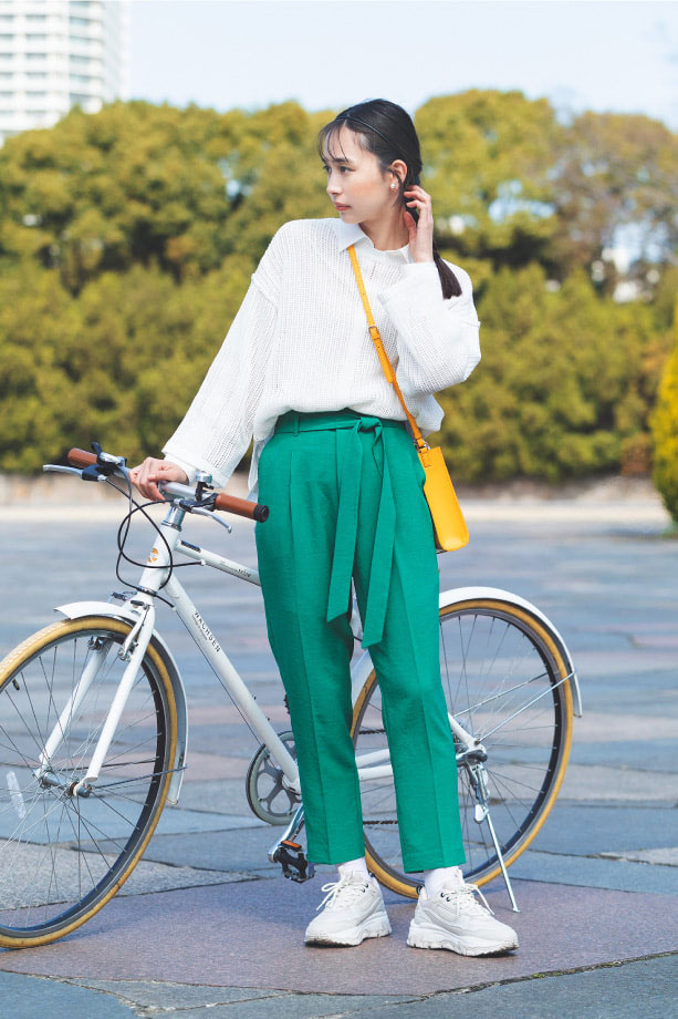 - 生き方美人さんが着ているのは、美easyのテーパードパンツ。「美easyシリーズのリネンタッチ素材は、再生ポリエステル使用で環境にも配慮。イージーケアでまめにお手入れできるから、長く着続けられるっていうところも、環境保護につながりますよね。もちろんVISだからお財布にやさしいプライス。美easyを選ぶことが地球と私の明るい未来のための一歩になってるって最高じゃない?」