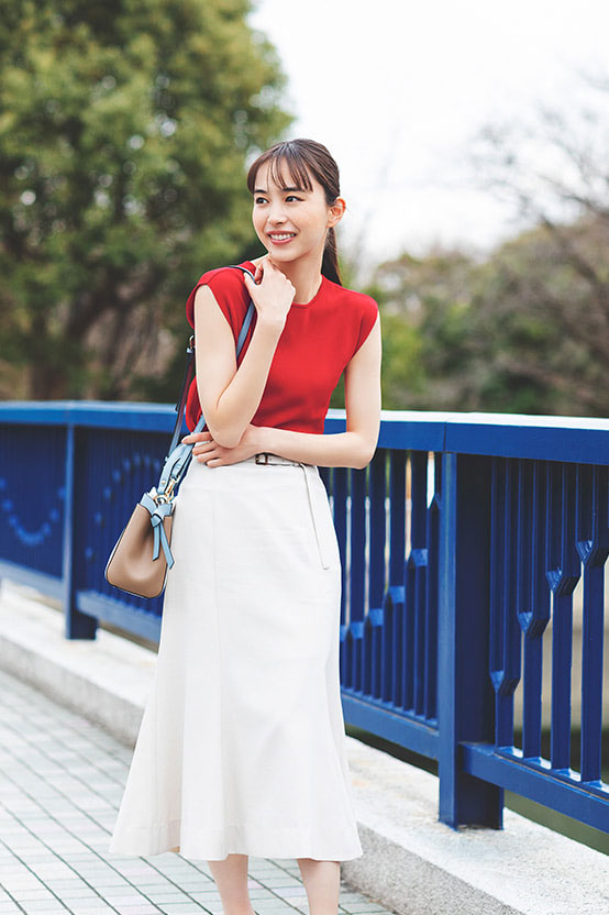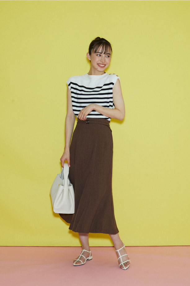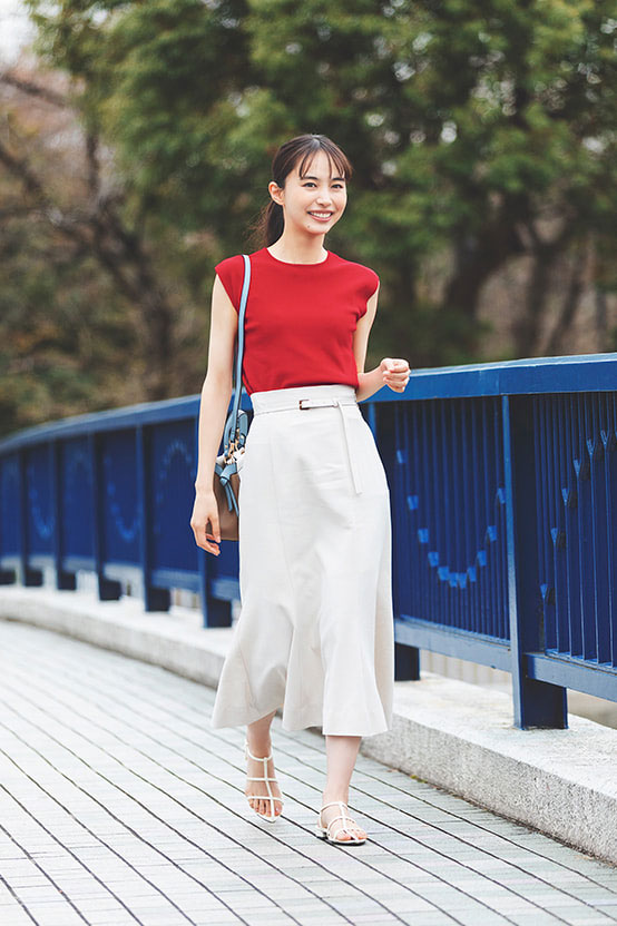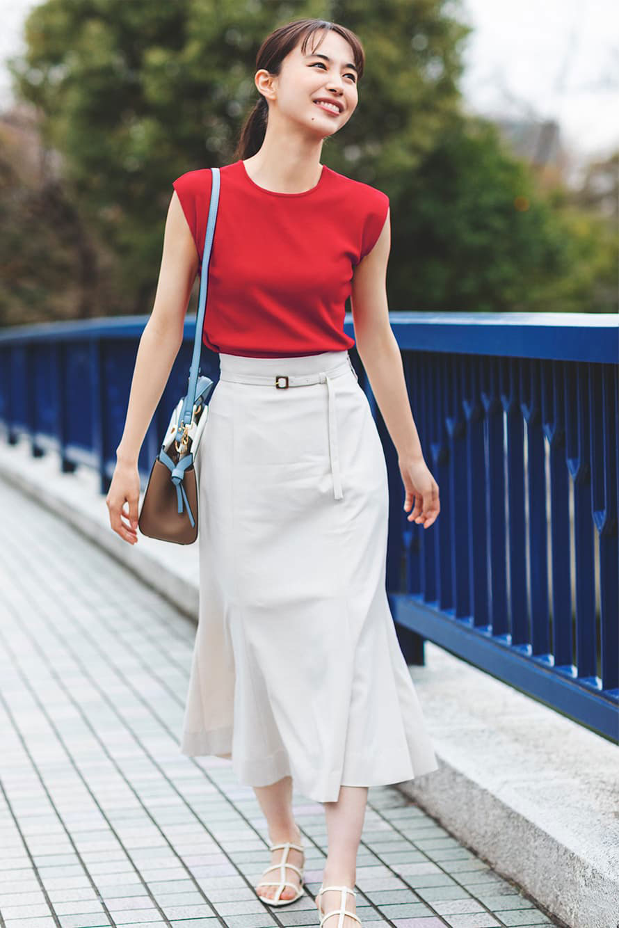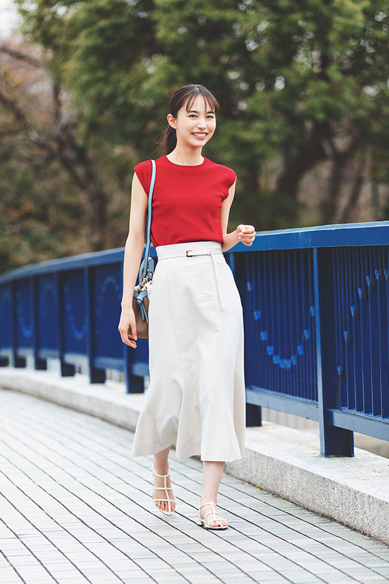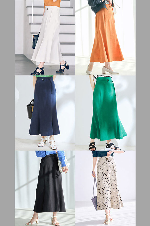 - 体型美人さんが着てるのは美easyのマーメイドスカート。「みんなが持ってるマーメイドだから、私はスタイルアップ効果で選びます。このスカートを着ると、細いとこは細く、出るとこは女性らしいフォルムに。カーヴィーなラインが上品に整うの。自分に自信を持てるし、褒められる確率もめちゃくちゃ高い。やっぱりVIS のマーメイドってすごいんです!」