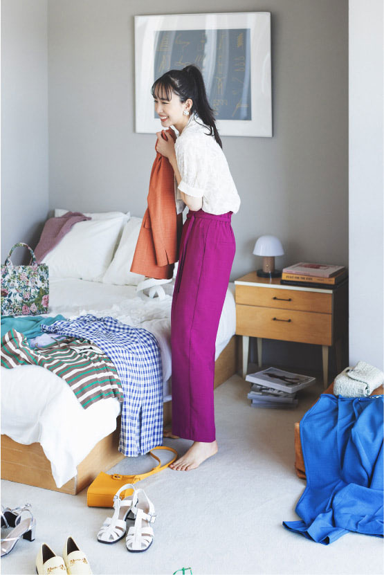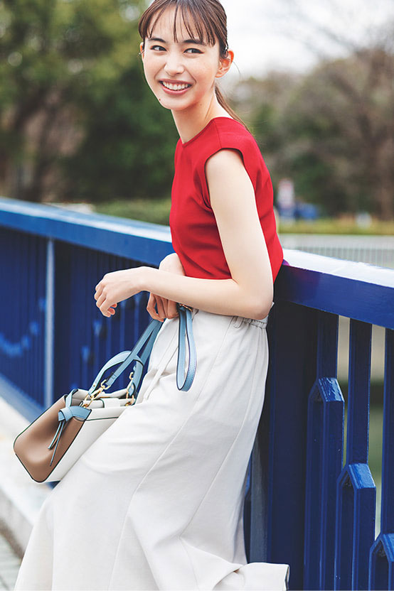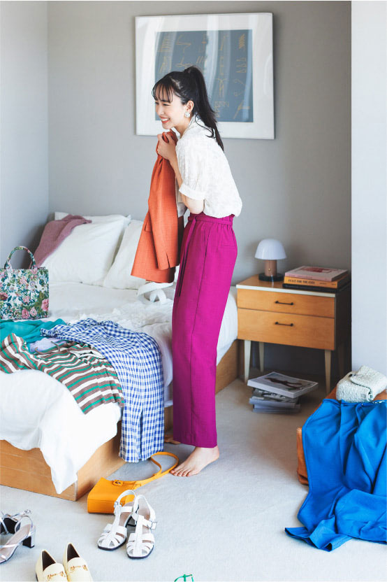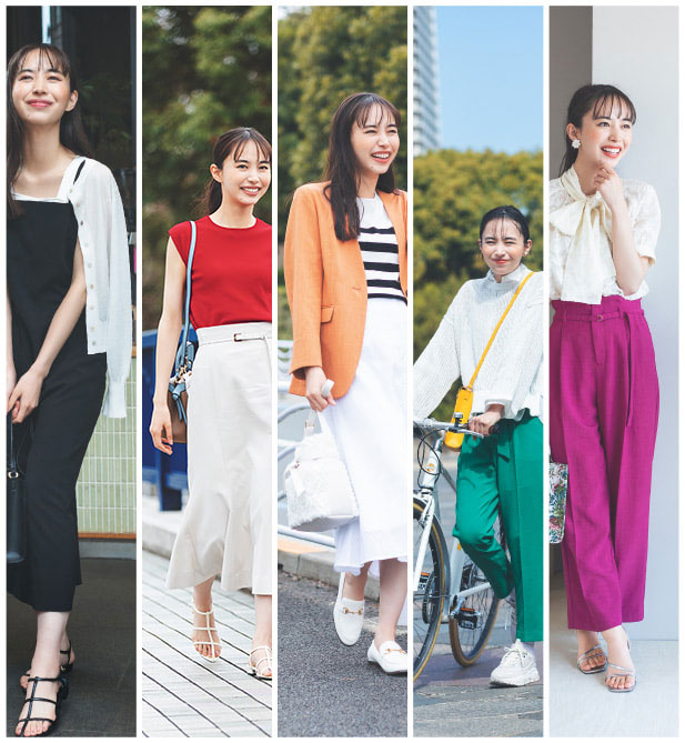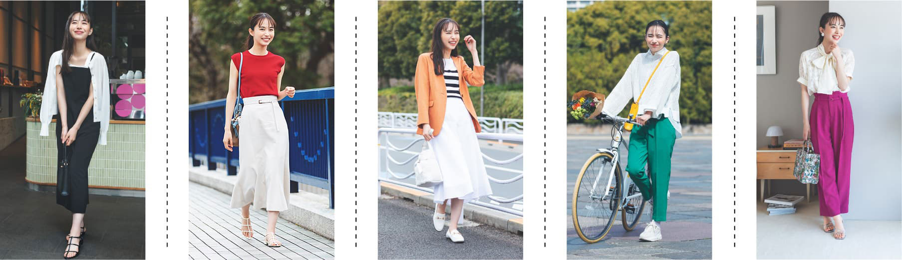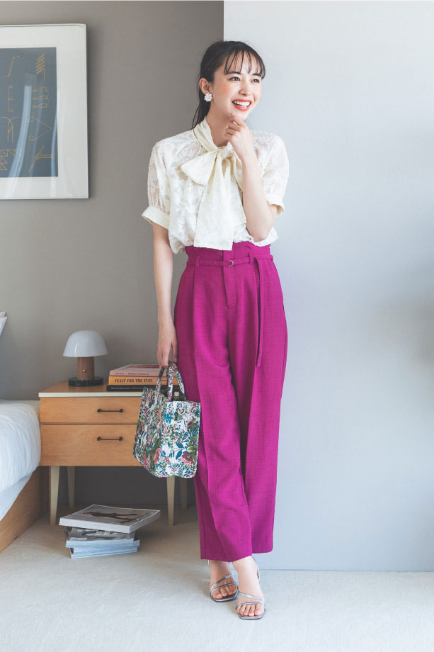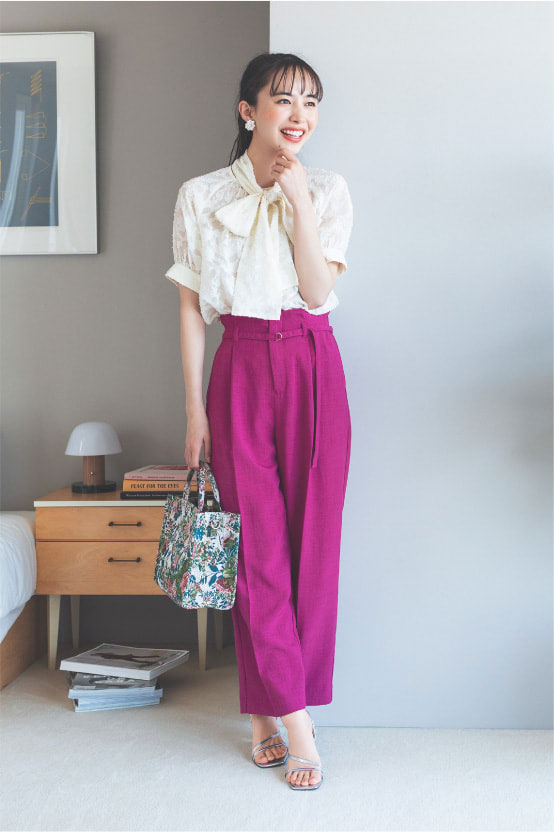 - コーデ美人さんが着ているのは美easyのワイドパンツ。「このパンツはじめ、美easyのアイテムってどれもコーデがオシャレ見えするデザインの工夫が入ってるらしい。ちょっとハイウエストだったり、縦ラインを強調するディテールだったり。どおりで、夏のシンプルなワンツーコーデでも、どことなくセンスよく見えるわけだ、納得。着こなしの幅が広がるから最近コーデが楽しくて仕方ない!」