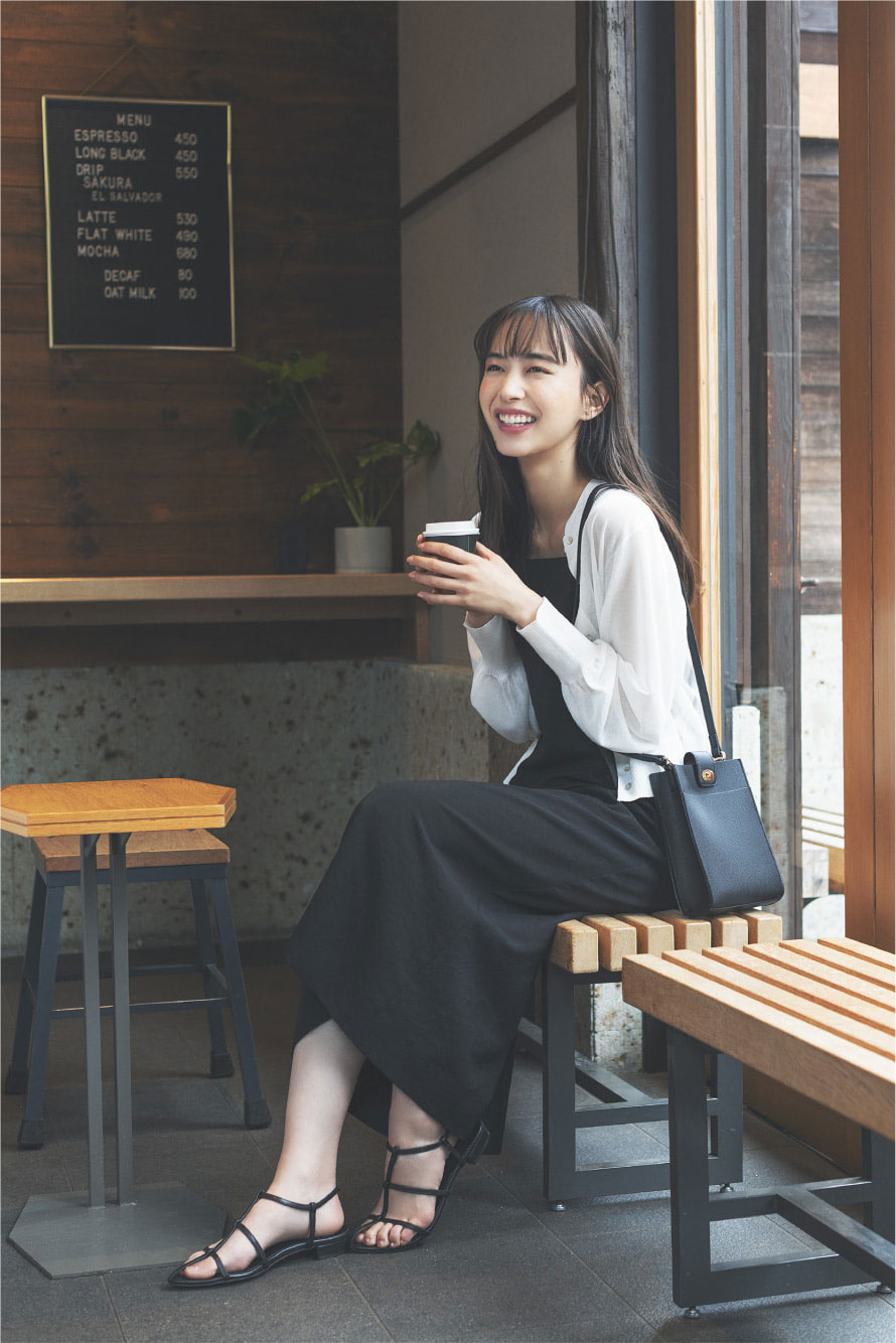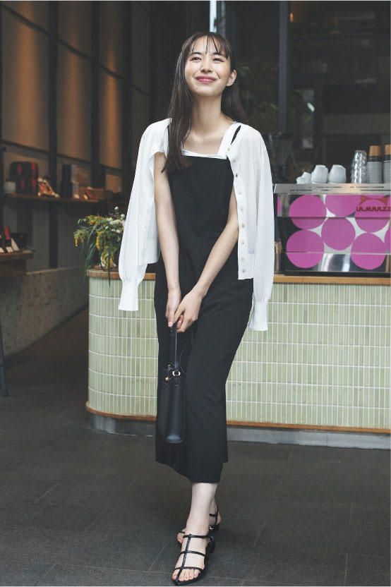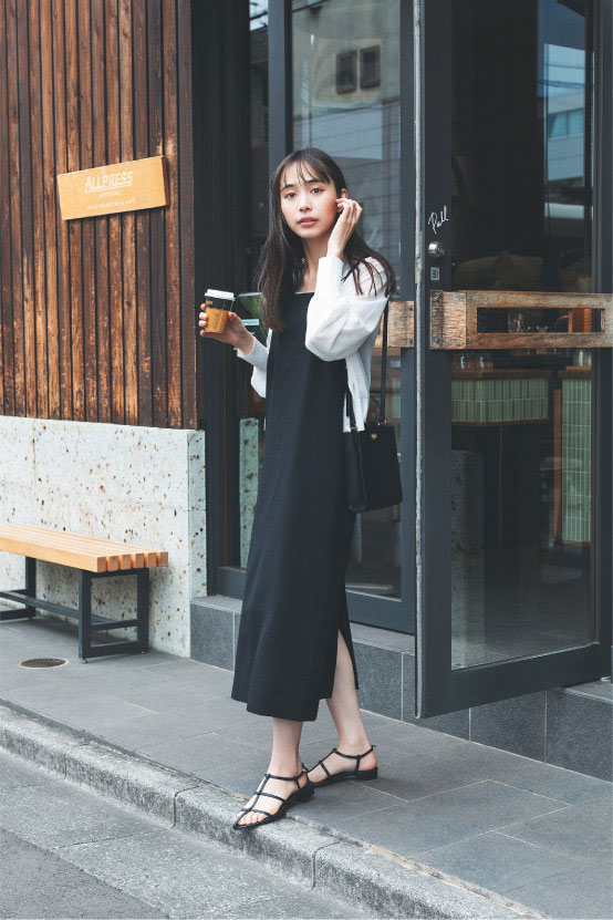 - 性格美人さんが着ているのは美easyキャミワンピース。「これ、少しナローなシルエットが大人っぽくて上品でしょ? 着こなしやすい黒ワンピはオンにもオフにも出番が多い。これね、きちんと印象なのに、実はおうちで洗濯が可能なの。ネットに入れて手洗いコースでOK。シワにもなりにくいから本当に手がかからない。いつもクリーンに着られるからますます好きになる!」