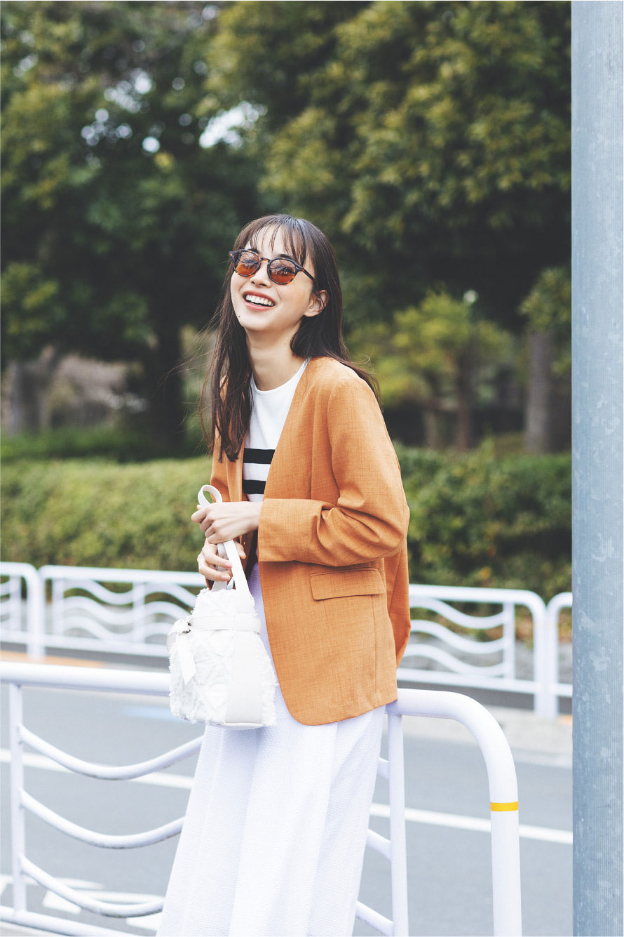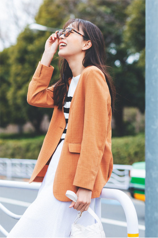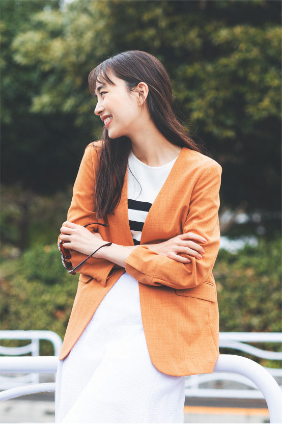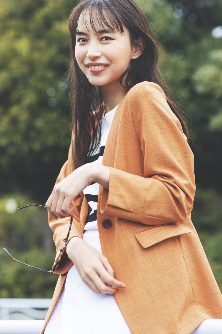 - 表情美人さんが着てるのは美easyのジャケット。「着ていてここまでノーストレスのジャケットって初体験。リネンタッチの素材はサラッと軽くて、接触冷感機能付き、シワにもなりにくい。ノーカラーVネックだから、カーデガン感覚で気軽に羽織れるの。インナーのデザインも選ばないから着回し幅も広くって大活躍。ワイドパンツやマーメイドスカートとのセットアップも可能なんだって。今度トライしてみたい!」