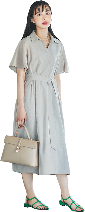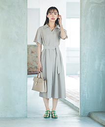 歩くと揺れる柔らかなリネンライクの素材と幅広リボンベルトで、エレガントさが増したスキッパーワンピ。顔まわりをスッキリ見せるスキッパーワンピは、きちんと見えも。ウエスト部分はゴム使用になっているので、着るだけで女性らしいラインをメイク。ベルトは取り外し可、自宅ケアもできるので、夏の通勤スタイルにも最適なワンピです。