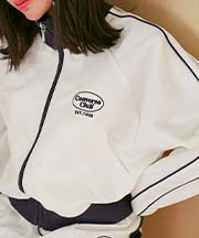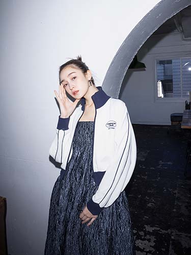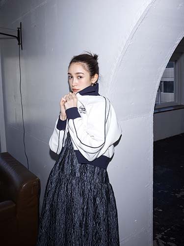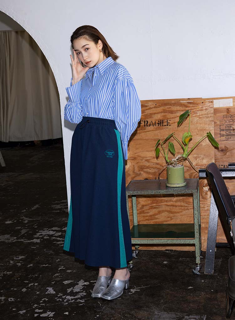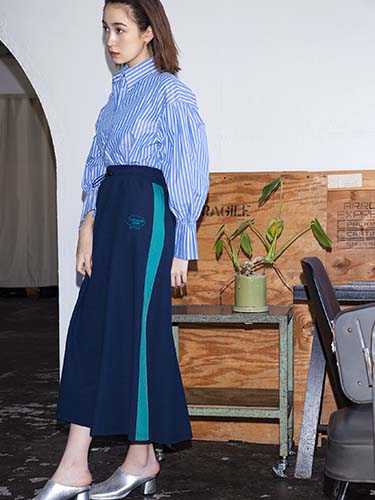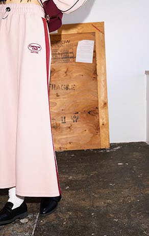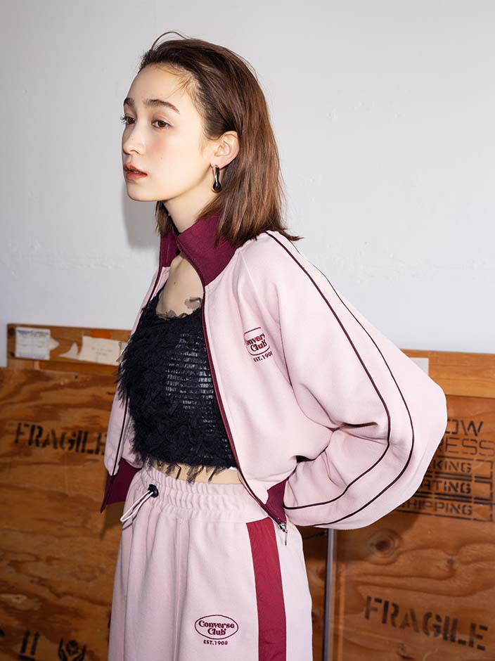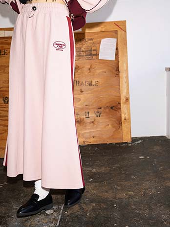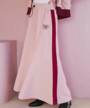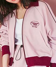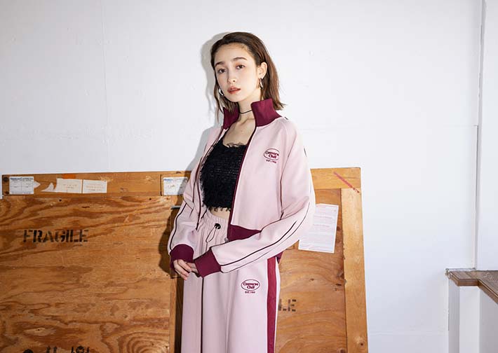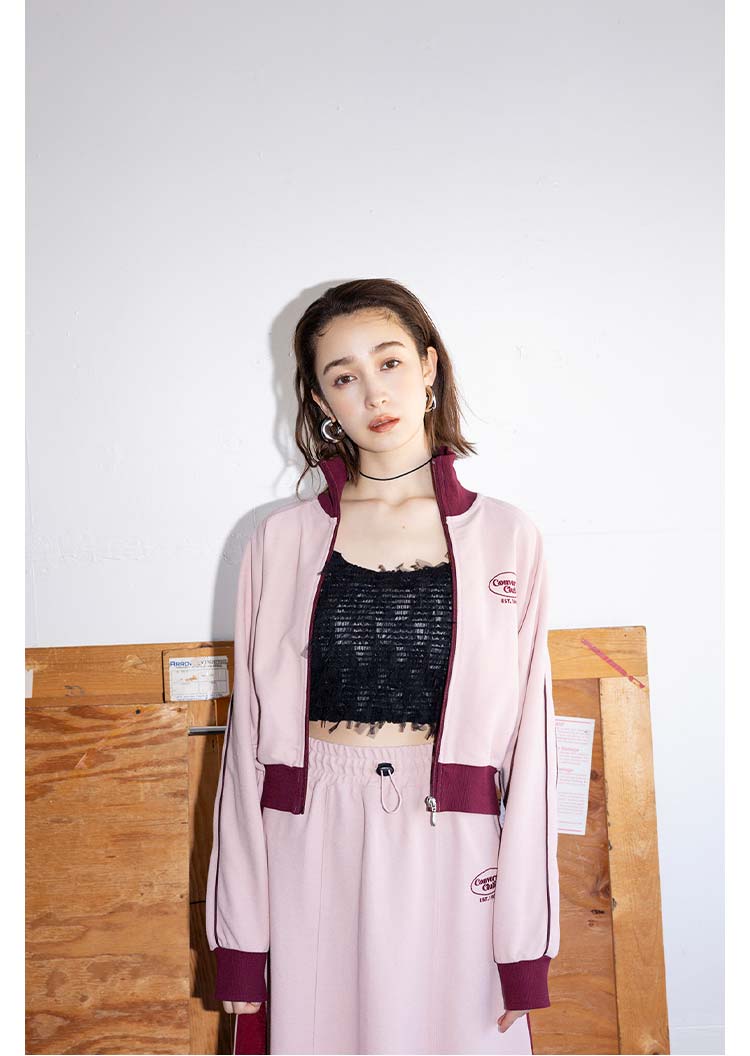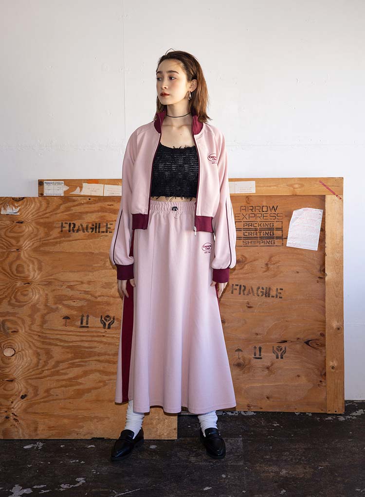 春らしい淡いピンクと大人っぽいボルドーカラーが組み合わさったジャージとスカート。