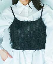 インナーに女っぽいレースの透けキャミソールを合わせて着るのがおすすめ。