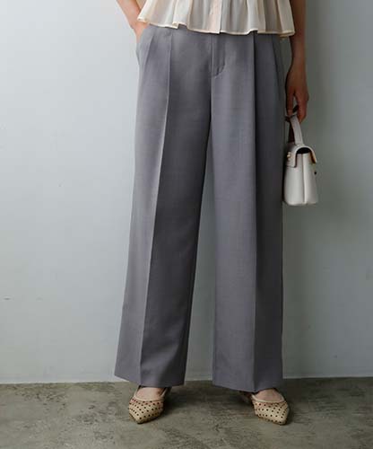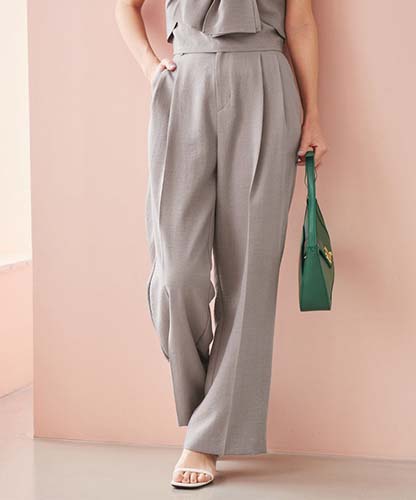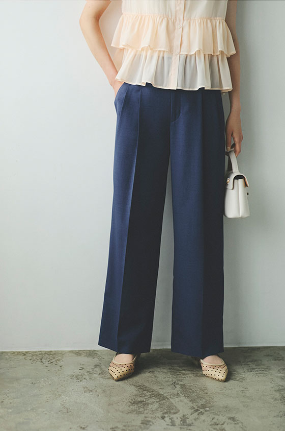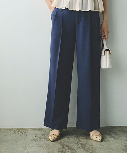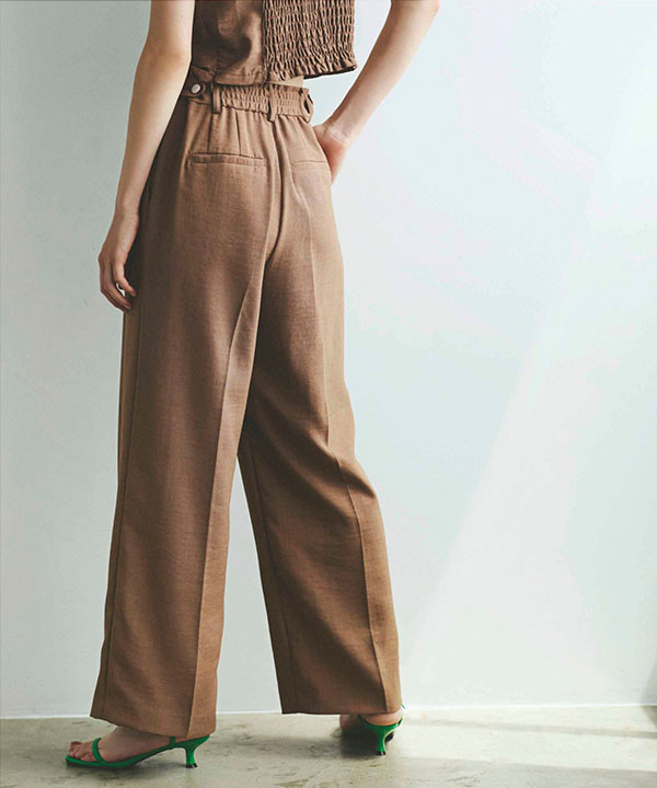 ウエストのフロント2タックと、中心タックから流れるセンタープレスが特徴の美脚ワイドパンツ。ウエストにシルバーのボタンを配し、アジャスター機能として使える仕様です。バックウエストはゴム仕様でリラックスして着られます。