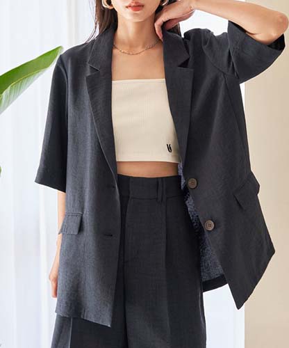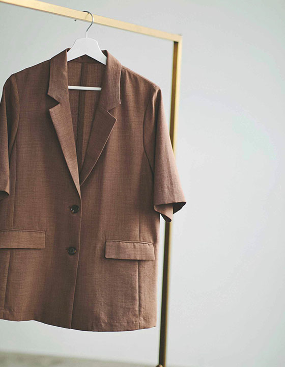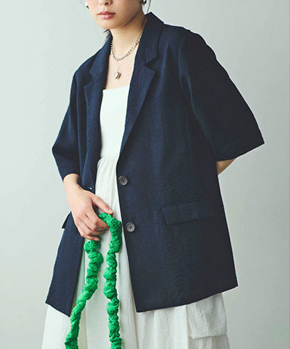 ノースリーブや半袖トップスの上に気軽に羽織れるシンプルなデザインのジャケットです。暑い日の日除けや冷房除けに活躍します。リラックス感のあるシルエットがONなスタイルだけでなくカジュアルコーデにも◎。