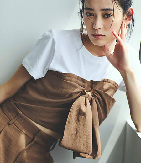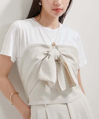 コーディネートを華やかに見せてくれるビスチェを重ね着しているようなレイヤードトップス。脇に付いたファスナーで着脱も簡単です。後ろはゴム仕様のため、程よいフィット感で着心地も◎。短め丈でスタイルよく決まる一着です。