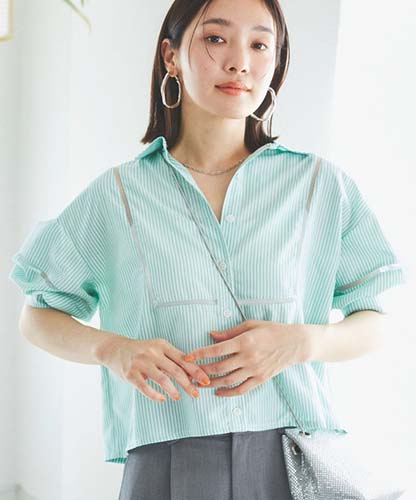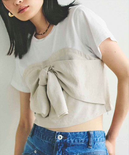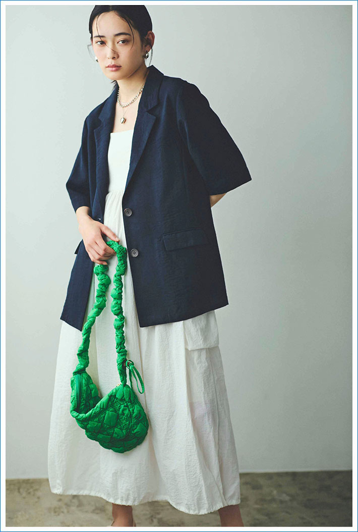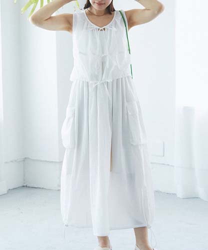 清涼感あるスタイル。さりげないポケットや華奢なリボンベルトが