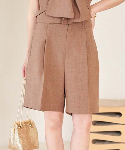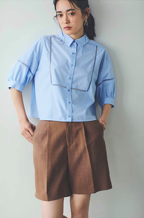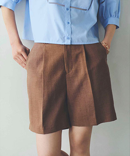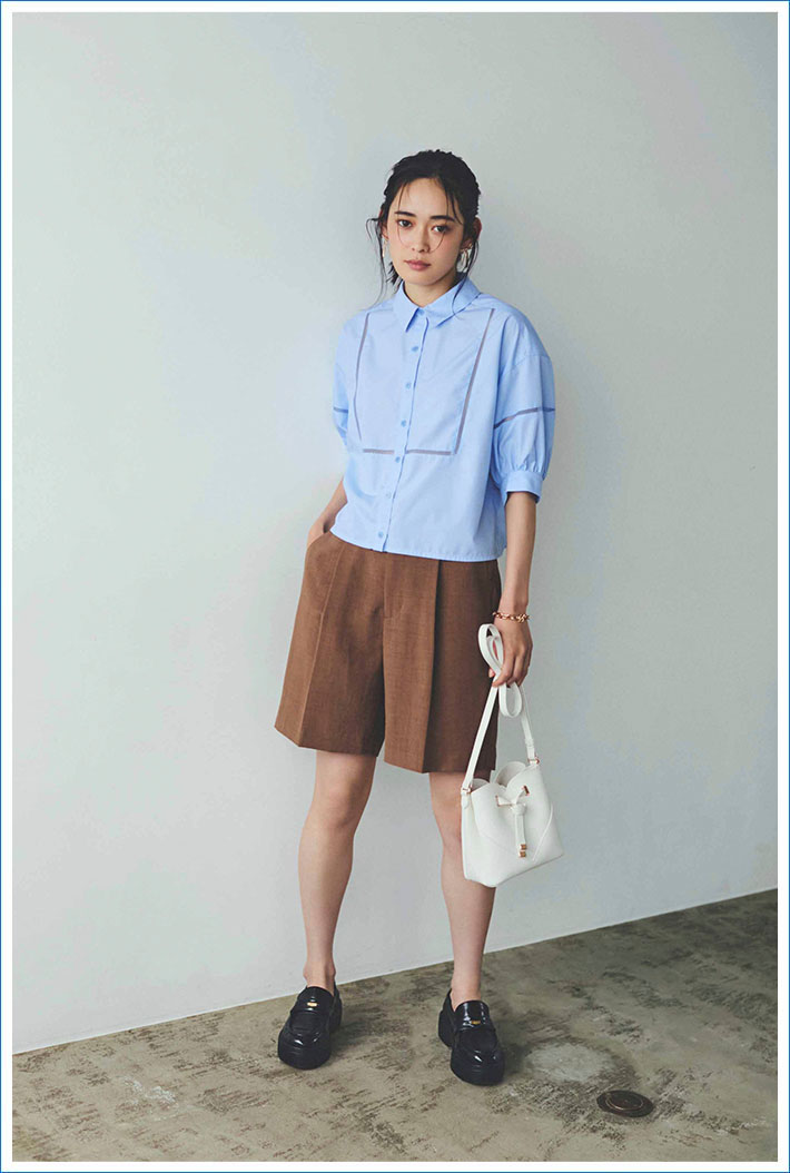 キュロットショートパンツを合わせたマニッシュなコーディネート。