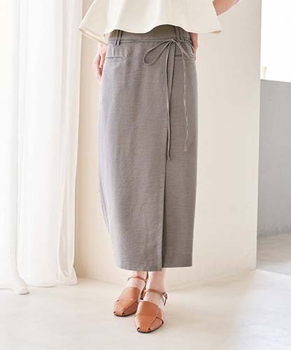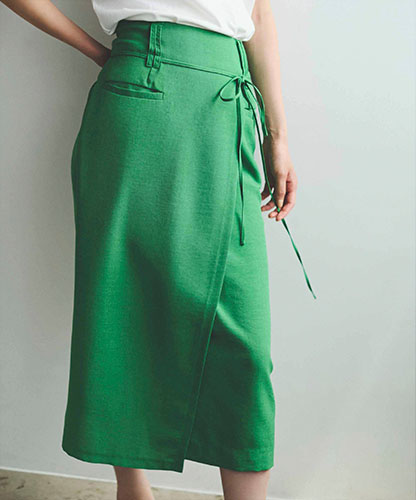 Iラインシルエットが今年らしいラップ風デザインのミディ丈スカートです。足首が綺麗に見える着丈に設定しているので、フラットなシューズとも好相性です。ウエスト後ろにゴムが付いていて、楽ちんな着心地です。