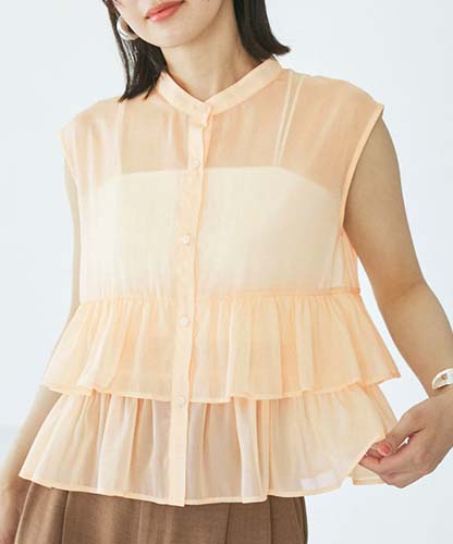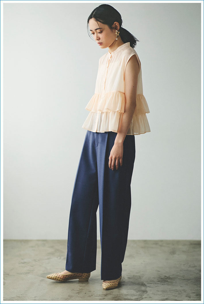 シアーな素材感とフリルがレディなブラウスを合わせた、